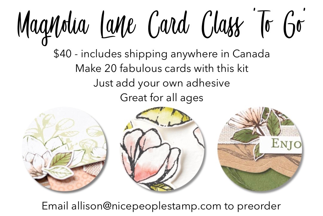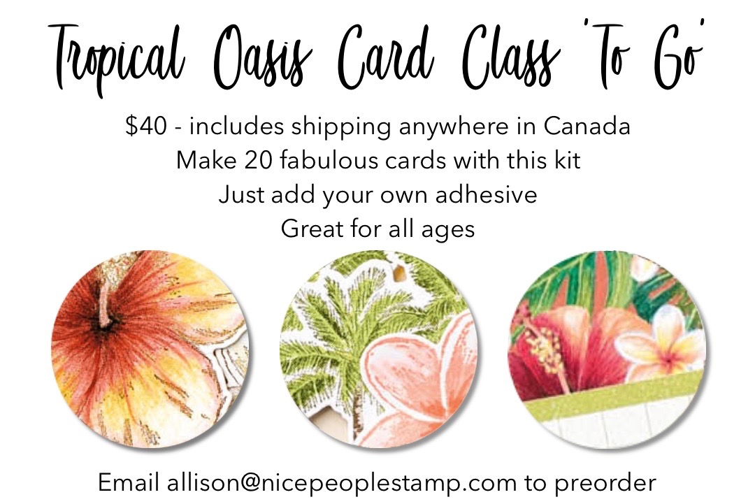 How to order: Email me at allison@nicepeoplestamp.com to let me know how many of each kit you’d like. You can pay via email $ transfer or PayPal. I will order the supplies from Stampin’ Up! and once the order arrives, prepare all the kits for mailing via Canada Post.