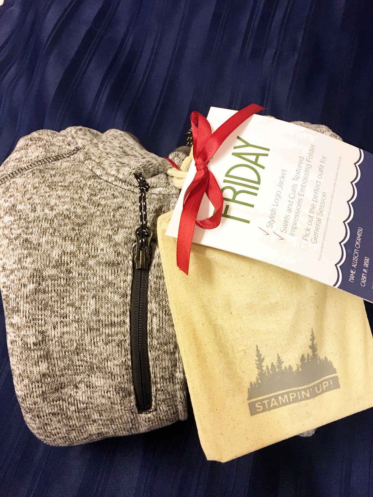 When we went back to our room I was SO thrilled to see that I had a gift waiting for me – a jacket! SO perfect for the Alaskan Cruise! Plus it’s super cute. There’s also an awesome new embossing folder in the little canvas bag!