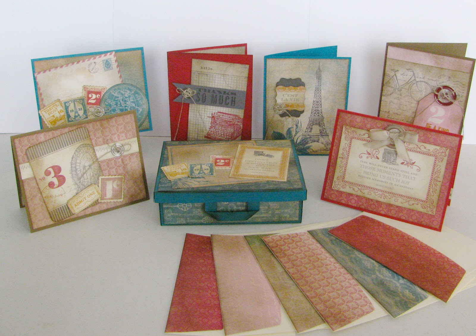 This is a class not to be missed! We are going to make 6 beautiful vintage-vibe cards with designer paper embellished envelopes, as well as the most adorable card box that looks like a miniature suitcase!