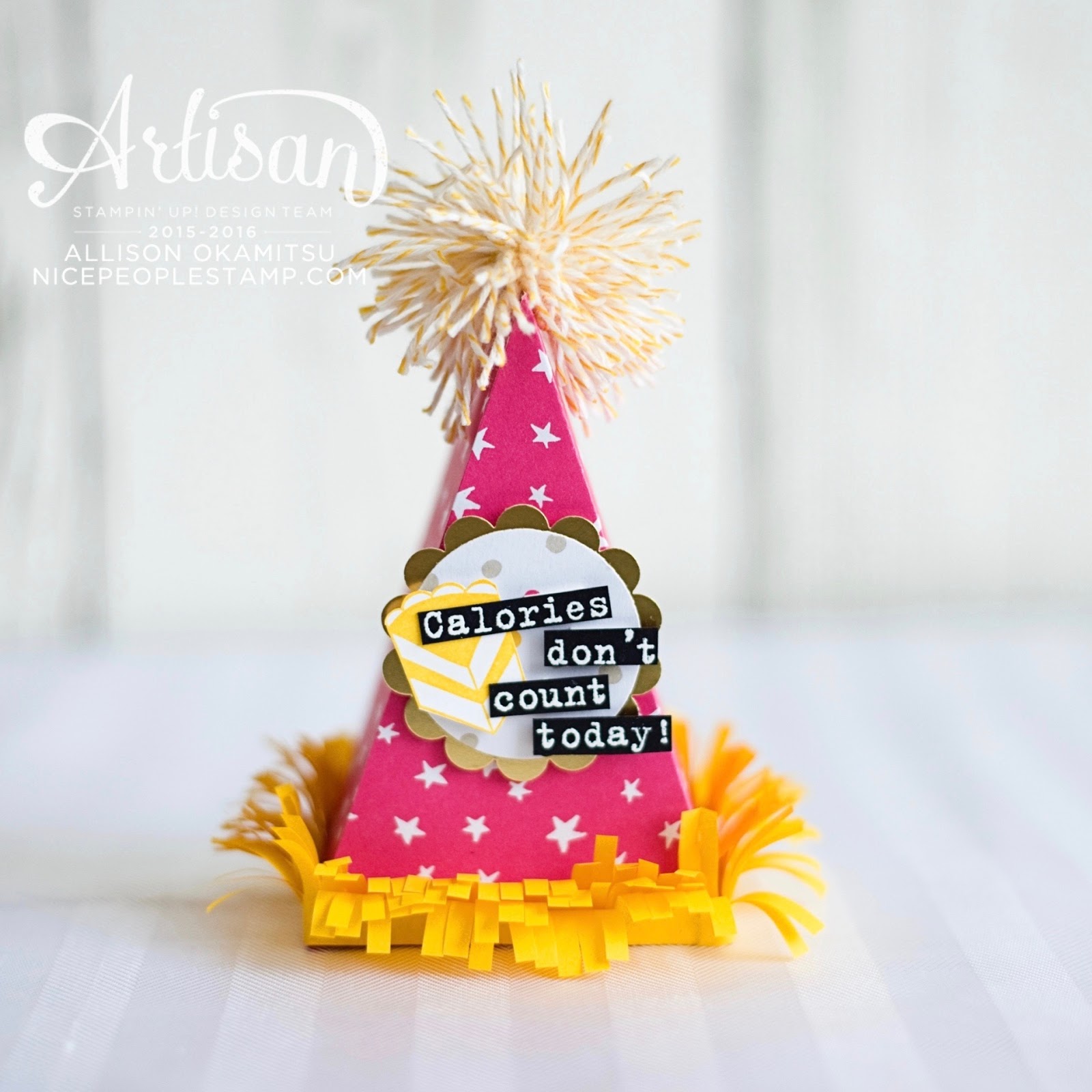 Eek! Isn’t this little party hat the cutest?! Using the Cutie Pie Thinlits to create this party favour is very easy, then simply add some of your favourite designer papers, stamp sets, and embellishments and you’ve got a party hat that everyone will love! I used the It’s My Party designer paper – LOVE those pink stars, then I embellished with the Party with Cake stamp set, Crushed Curry Baker’s Twine, and Cotton Paper. The Fringe Scissors make that fun fringed edge a breeze. Wouldn’t these be adorable all lined up for some party decor, and then you could send each of your guests home with one.