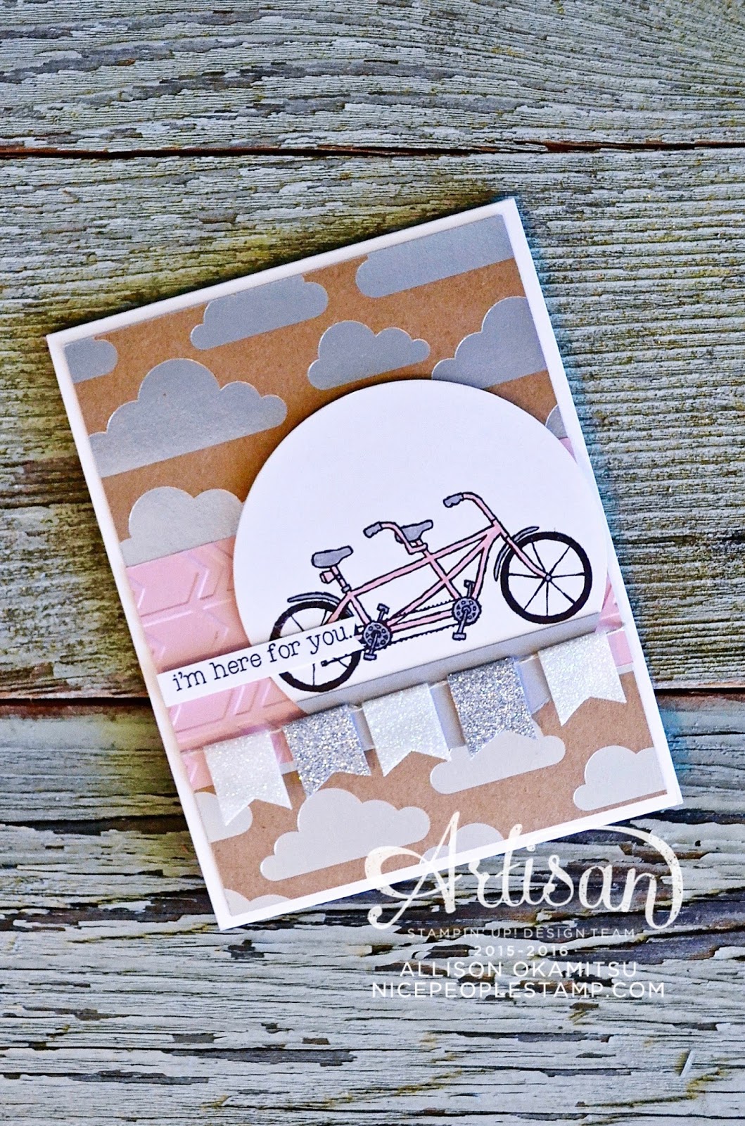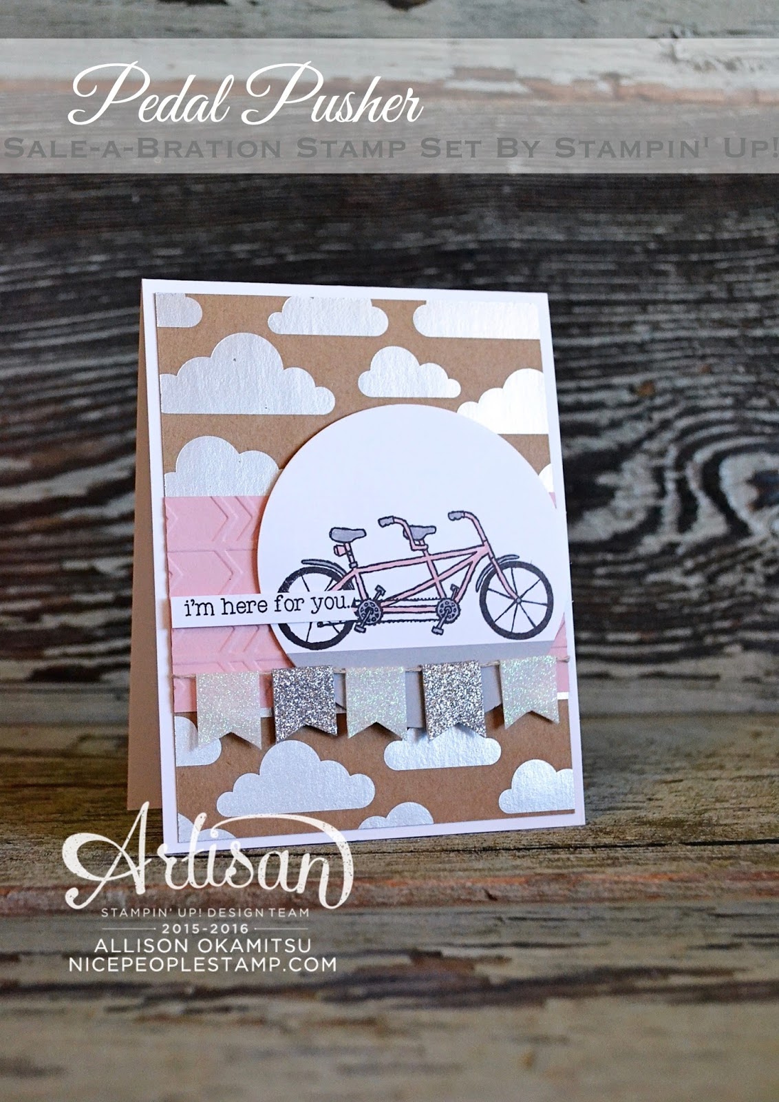 My card today uses the stunning silver cloud patterned paper you’ll find in this collection, as well as the Pedal Pusher stamp set – which can only be earned when you place an order of $60 CAD until March 31st.