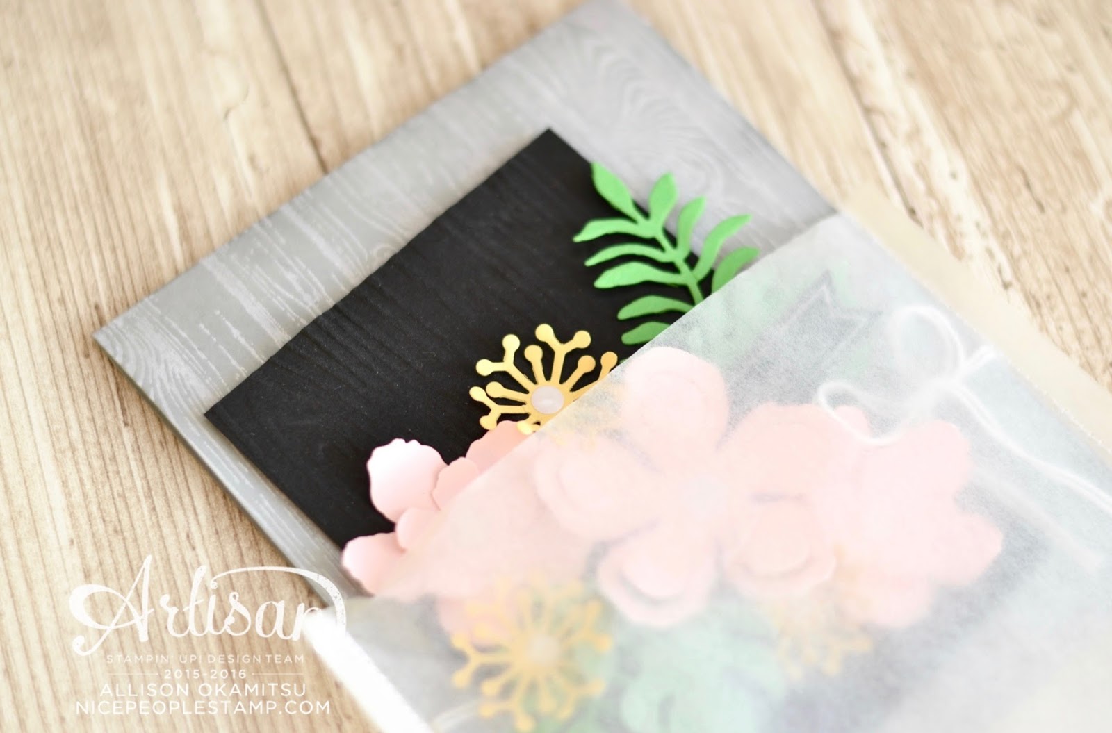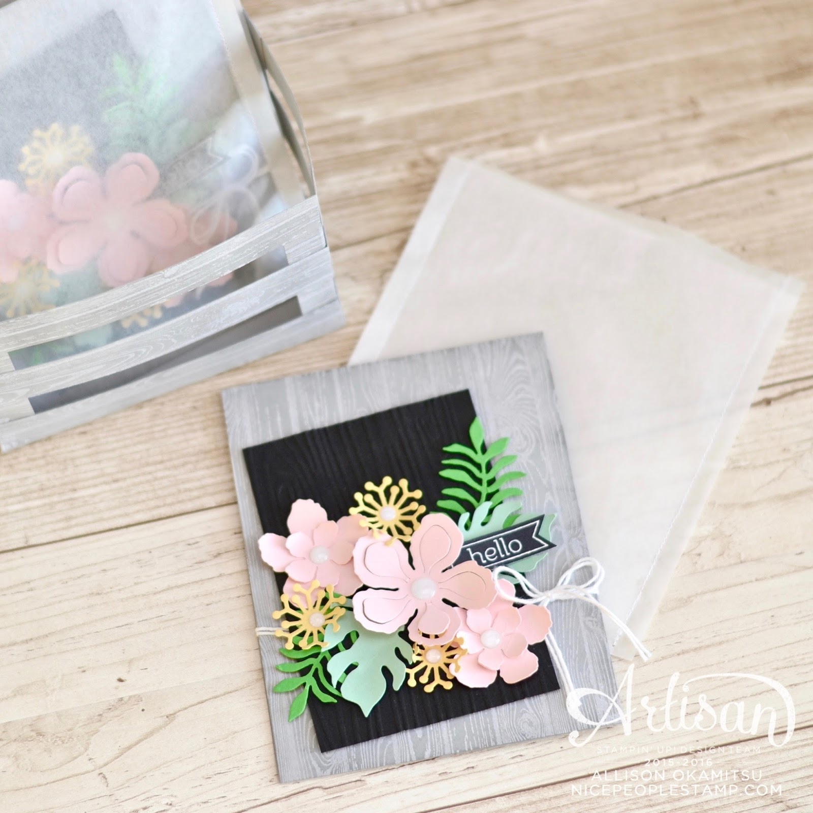 I love all of those soft and pretty flowers against the bold, black background. And I love the glassine envelope — it totally goes with the softness of the card. I hope you have a wonderful time away, Allison, and enjoy every minute!