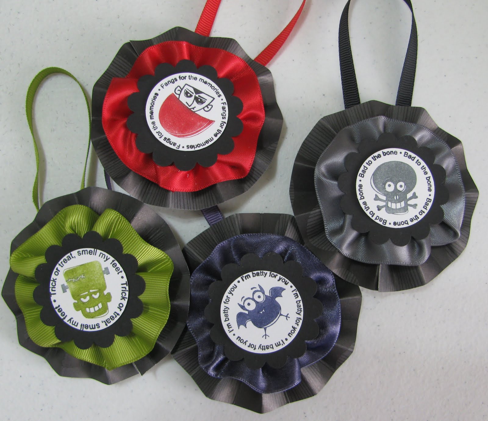 I made these decorations with the Batty for You stamp set! I just LOVE this set! Anything I can punch and layer is just my style! I used the 1 1/4″ punch and layerd it with the Scallop Circle Punch for my focal image. Then I surrounded that with some ruched ribbon and an accordian fold paper medallion. I didn’t have any Elegant Eggplant ribbon, so I took some White Satin Ribbon and painted it Eggplant with my marker! It worked perfectly!