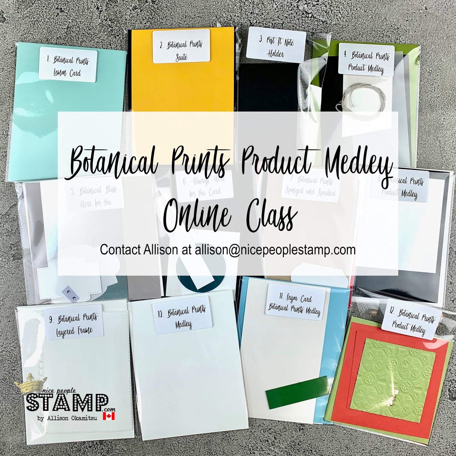 This online class is is for the experienced stamper who has a large selection of supplies and feels comfortable making substitutions with ink colours and such should you not have the exact products used to complete the projects in the tutorial. Of course you’ll need the Botanical Prints Product Medley to complete your projects.