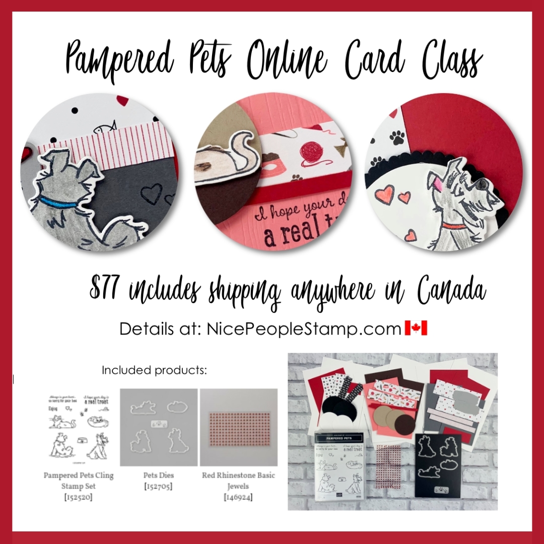 This class to go kit is $77 (including shipping) and has the supplies to make 6 cards and includes the Pampered Pets Bundle and Red Rhinestones. You’ll just add your own adhesive, clear blocks for your stamps, die cutting machine, black ink pad, and colouring tools for your pets (I’ll be using watercolour pencils and a blender pen for mine, but you can use whatever you have). If you already own the included bundle or rhinestones, please email me and we can make substitutions.