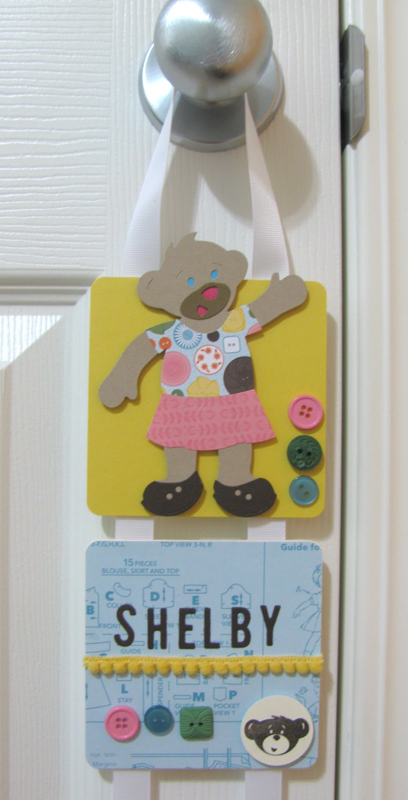 The Build-a-Bear Class was a real treat for me. There were a bunch of darling little girls here to create the Magnetic Dress-Up Tin and they also did this doorknob hanger as their bonus project. The girls were so sweet and lovely, real gems. I hope they had as much fun as I did!