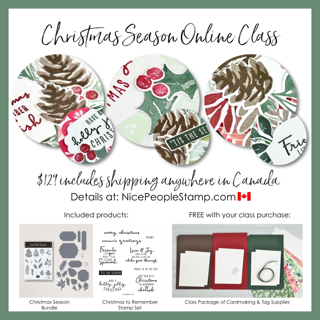 How to order: Email me at allison@nicepeoplestamp.com to let me know you’d like to order this class. You can pay via email $ transfer or PayPal. I will order the supplies from Stampin’ Up! and once the order arrives, prepare all the kits for mailing via Canada Post.