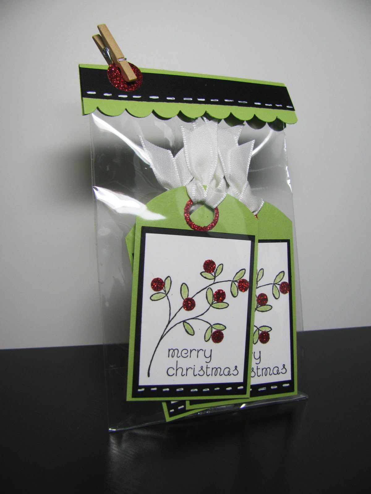 So have you ever noticed the selection of Cellophane Bags on pg. 181 of the catalogue? They’re kinda hiding, but once you find them and get some you’ll be addicted! I have been putting everything in these little babies, including Christmas tags! I made up these little packages of tags for a customer recently and now I’m making up little bags of tags like crazy! These ones use the Easy Events stamp set, PERFECT for tags for all occasions. Oh, and my other addiction? Those mini clothespins! I’m putting them on everything! So if you want some you better order them sooner rather than later! I think I’m cleaning out the warehouse!