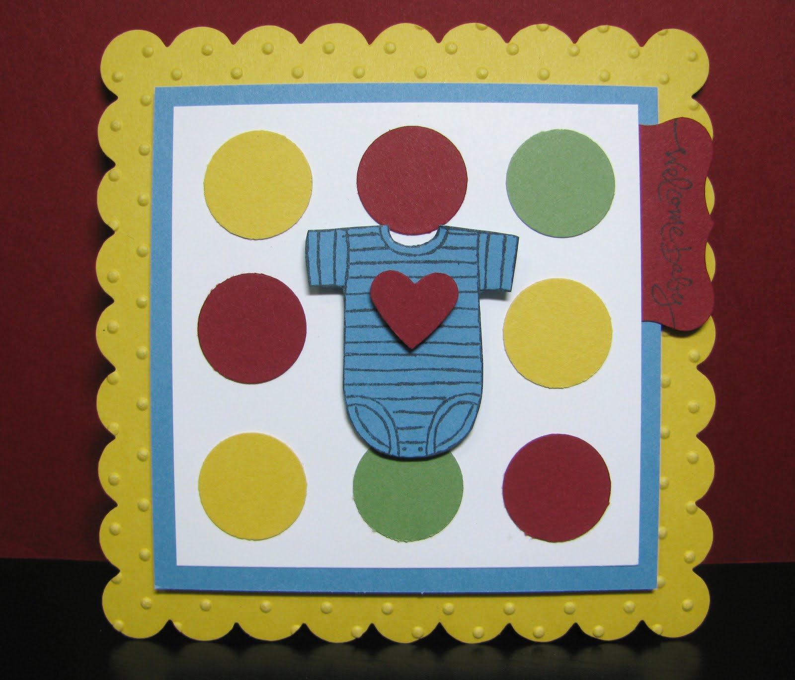 Anyways, enough about me…Let’s get to that card! I used the Baby Tees jumbo wheel and the Short & Sweet stamp set for my stamping. The beautiful card shape was cut with the BIG SHOT and the Scallop Square die. I also used the Perfect Polka Dots embossing folder for a little added texture. And of course I used some of the new colours!!! Daffodil Delight, Marina Mist, Cherry Cobbler, and Wild Wasabi.