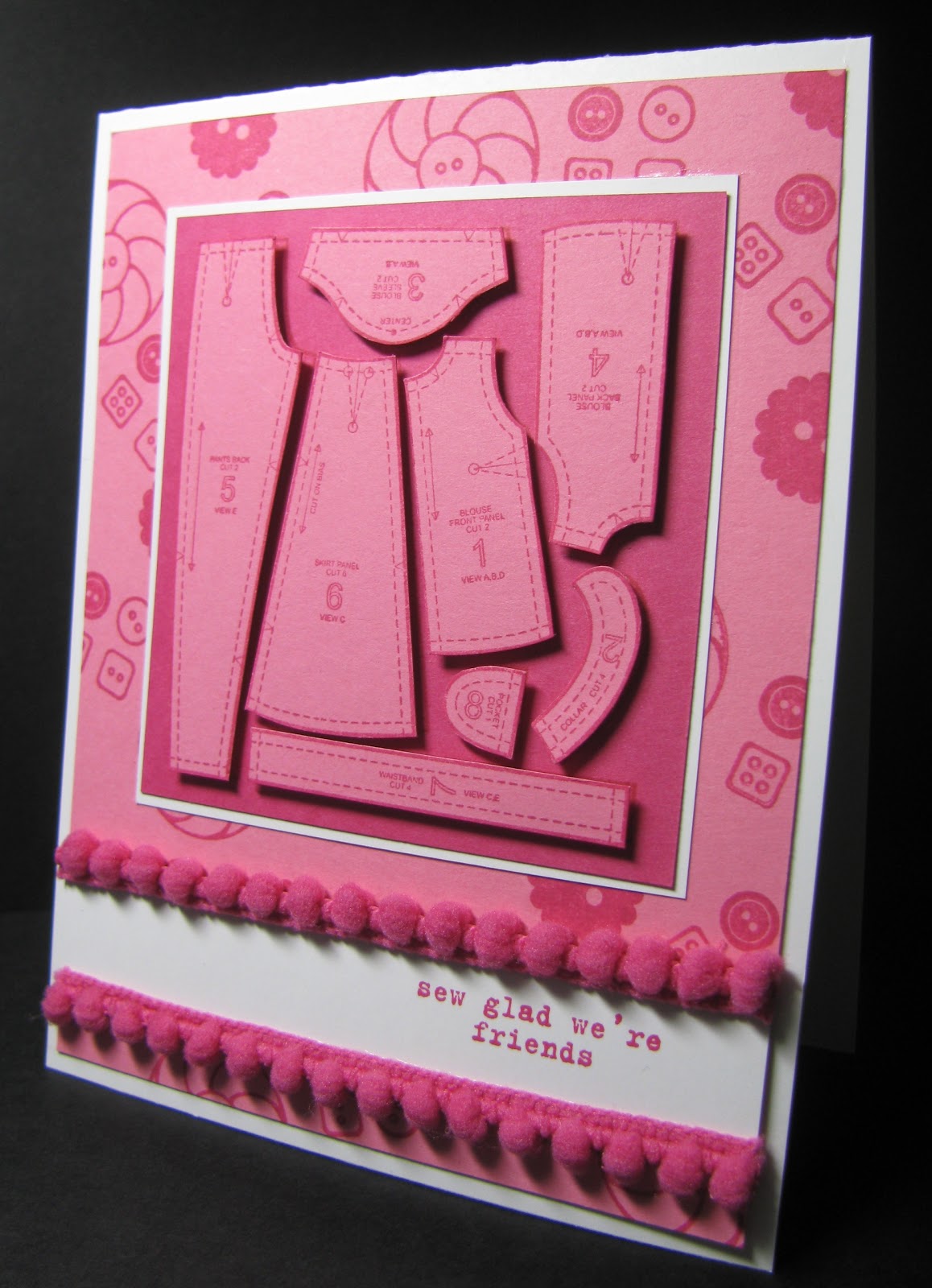 For this card I used an adorable new A la Carte stamp called Pattern Pieces. At only $11.95, this will be an adorable addition to your stamping supplies. For the background paper, I used the Button, Button stamp set. A set with 17 different adorable buttons for your crafting desires. And the MOST adorable embellishment I’ve used in probably forever….POMPOM Trim! Seriously! This stuff is fuzzy and cute and oh so adorably pink! (Melon Mambo to be exact).