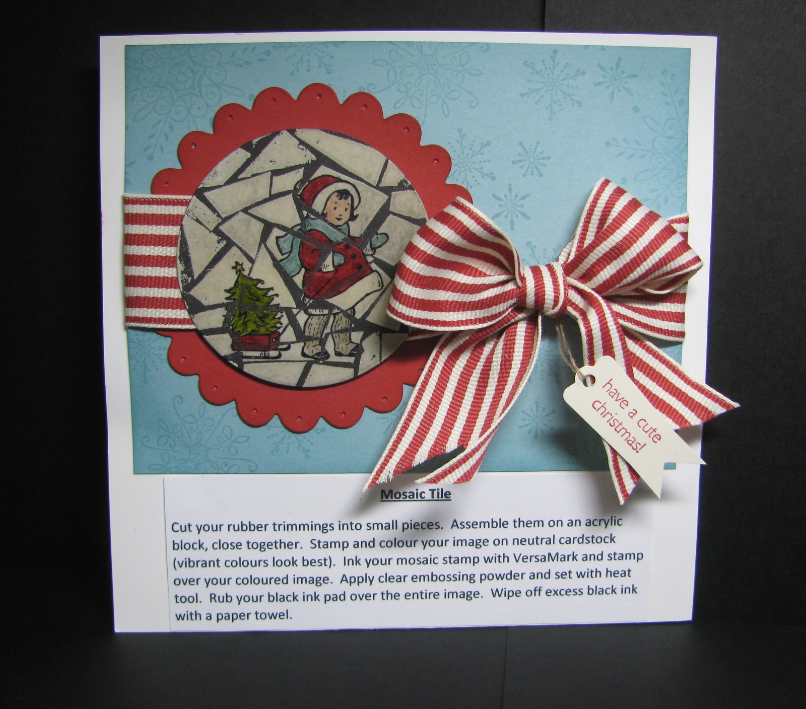 Last night was my last Stamp Club meeting for December, so we made some Christmas projects for those who may need a little last minute push on their Christmas crafting. Our technique this month was Mosaic Tile.
