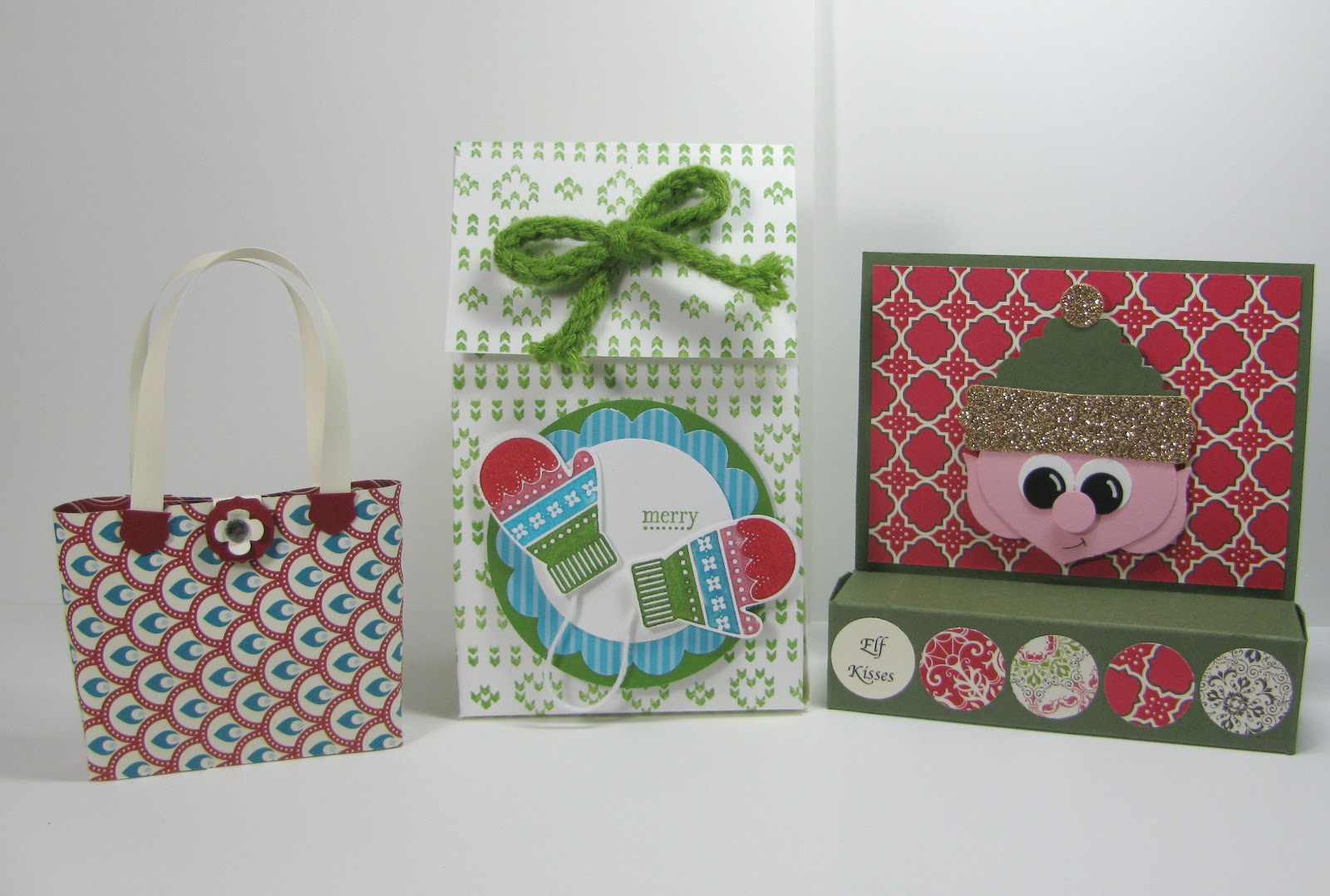 This month at Stamp Club it was all about holiday packaging. With Christmas quickly approaching I thought the ladies would like to learn some fun packaging alternatives that they could probably make with supplies they had on hand. No fancy dies needed to make these, just a paper trimmer and the Simply Scored. Oh, except for the little elf cutie, he needs a bunch of punches.
