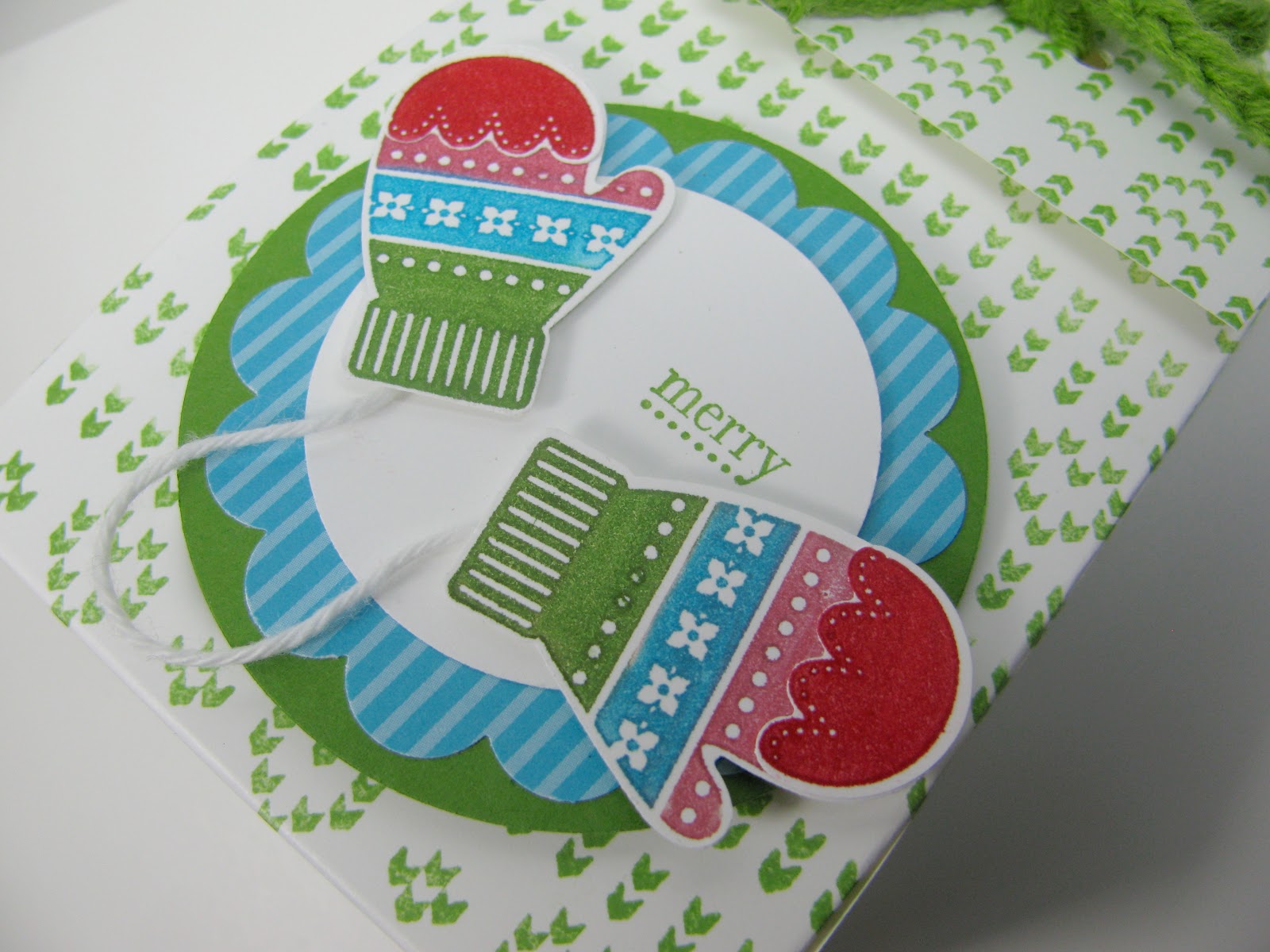 The 2-5-7-10 box has been around for what seems like forever, but it’s always a great go-to. There’s an easy to follow tutorial HERE. I used the Nicely Knit wheel stamp in Gumball Green on Whisper White cardstock for my base. And the Make a Mitten stamp set and co-ordinataing punch for the adorable mittens.