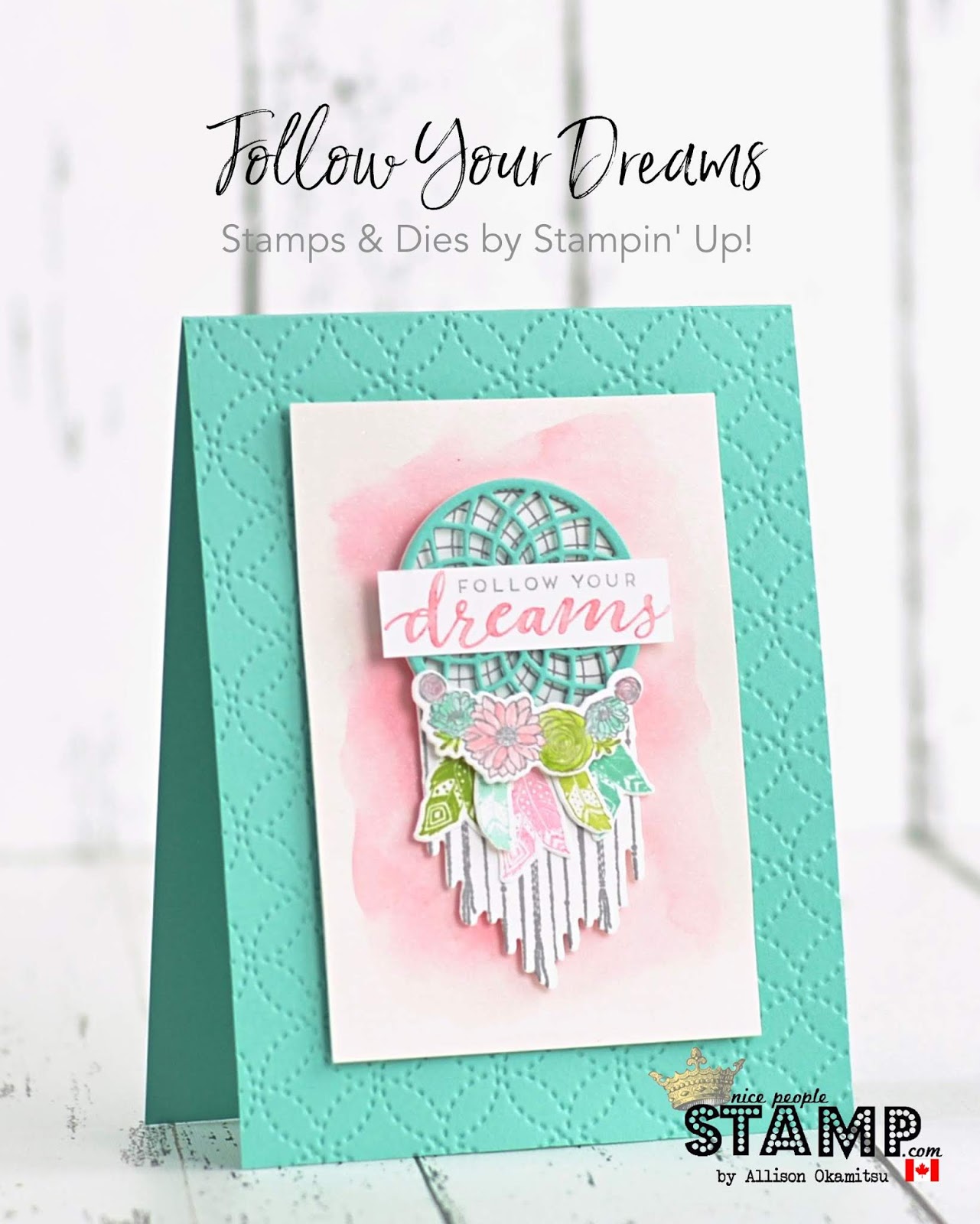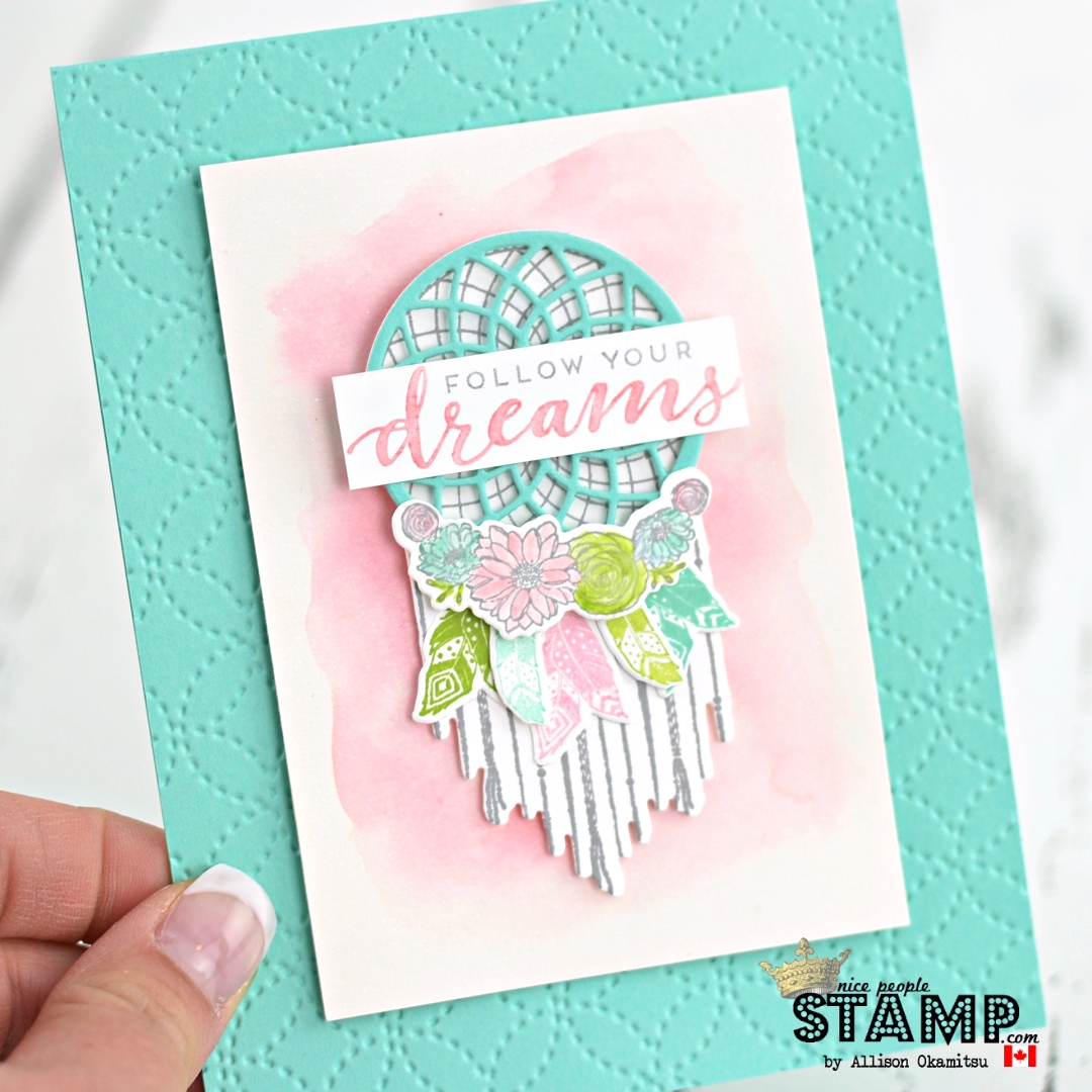 The Follow Your Dreams Stamp Set and the coordinating Chase Your Dreams Framelits make for a stunning card. It’s really just the stamp set and dies doing all the work here. They’re showstoppingly beautiful and all I did was add a watercolour wash in the background and some embossing on the card base.