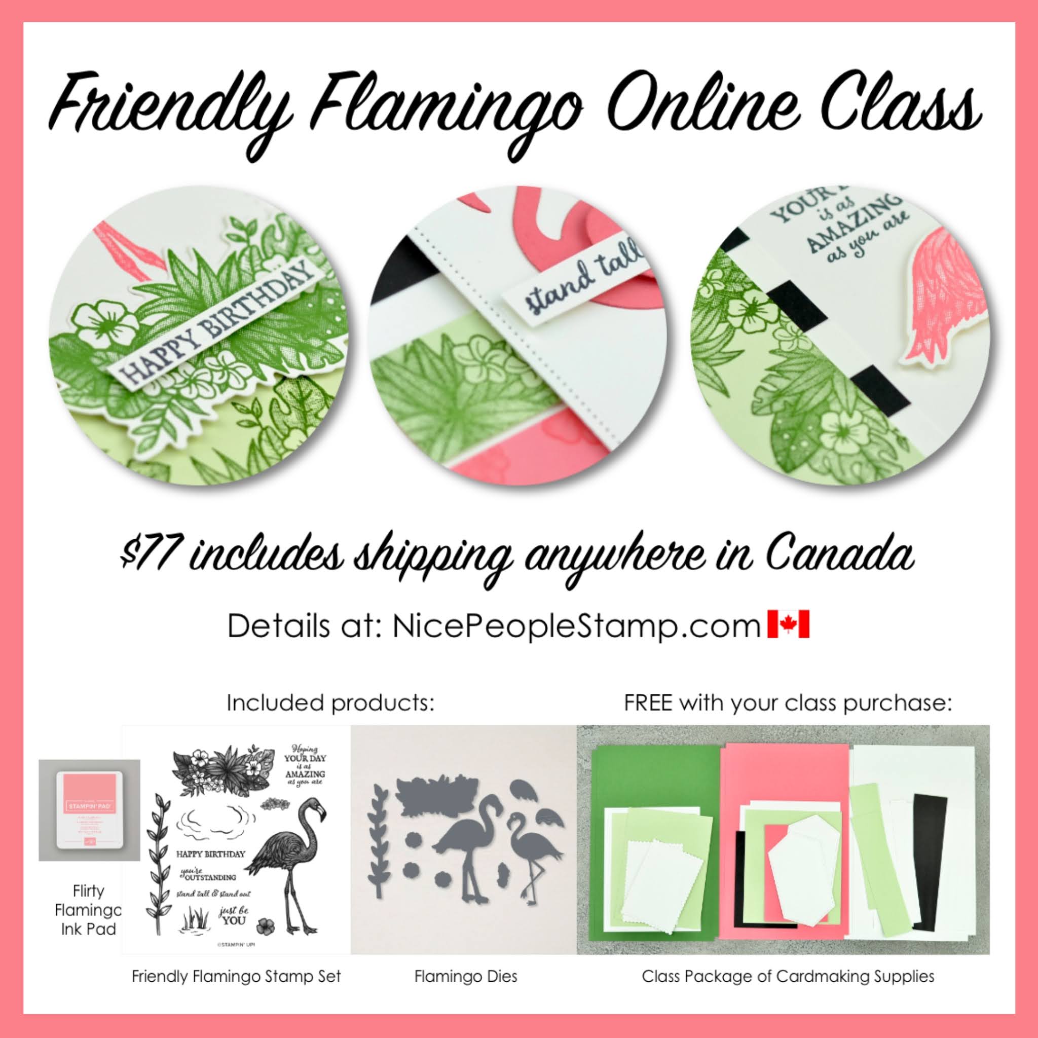 This class to go kit is $77 (including shipping), has the supplies to make 6 cards and includes the Friendly Flamingo Bundle of stamps and dies and Flirty Flamingo Ink Pad. You’ll just add your own adhesive, clear blocks for your stamps, ink pads (Black and Garden Green – or use what you have). You will also need a machine that works with Stampin’ Up! dies and a paper trimmer. If you already own any the included products, please email me and we can make substitutions.