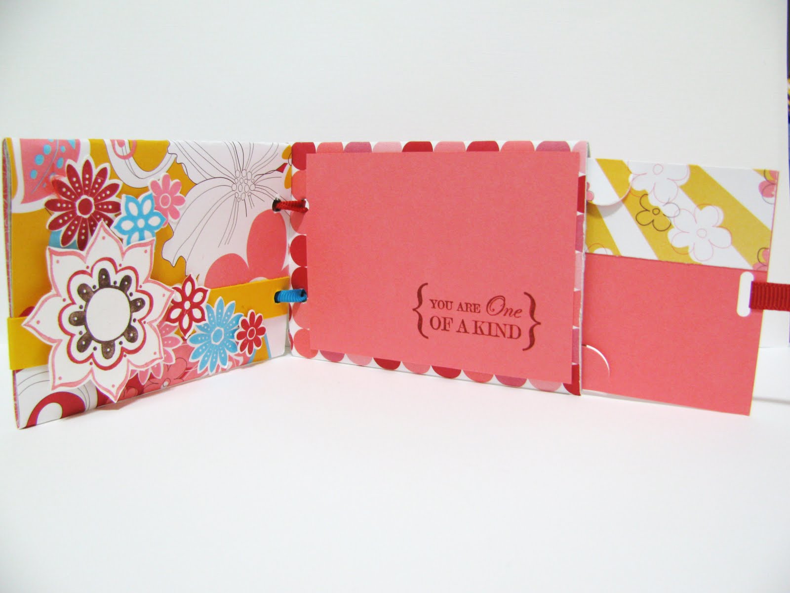 The beautiful patterned paper is the Pink Flamingo Designer Series Paper. I just love how bright and cute it is! I’ve also used Cameo Coral, Chocolate Chip, Whisper White, Tempting Turquoise, Real Red and Summer Sun for my punching, stamping, and embellishing. These colours go so fantastically together! The saying on the front cover is from the Only Ovals Stamp Set and the flowers and sentiment on the inside is from the One of a Kind Stamp Set.