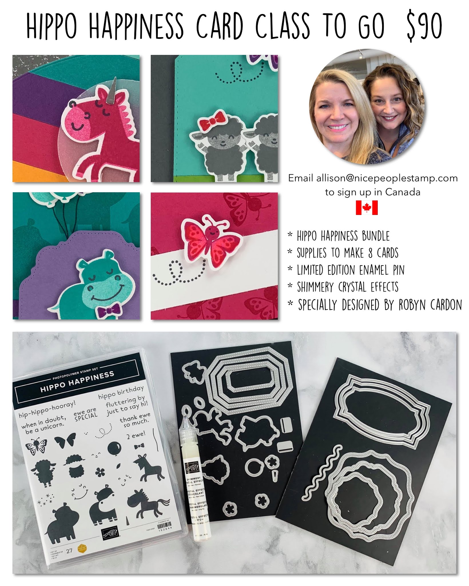 I am so incredibly excited to offer a rare repeat of one of my online classes! The Hippo Happiness Card Class To Go is designed by my stamping bff, Robyn Cardon, using her million dollar bundle and I’m so excited I can bring this class back to share with those who could not join me the first time.