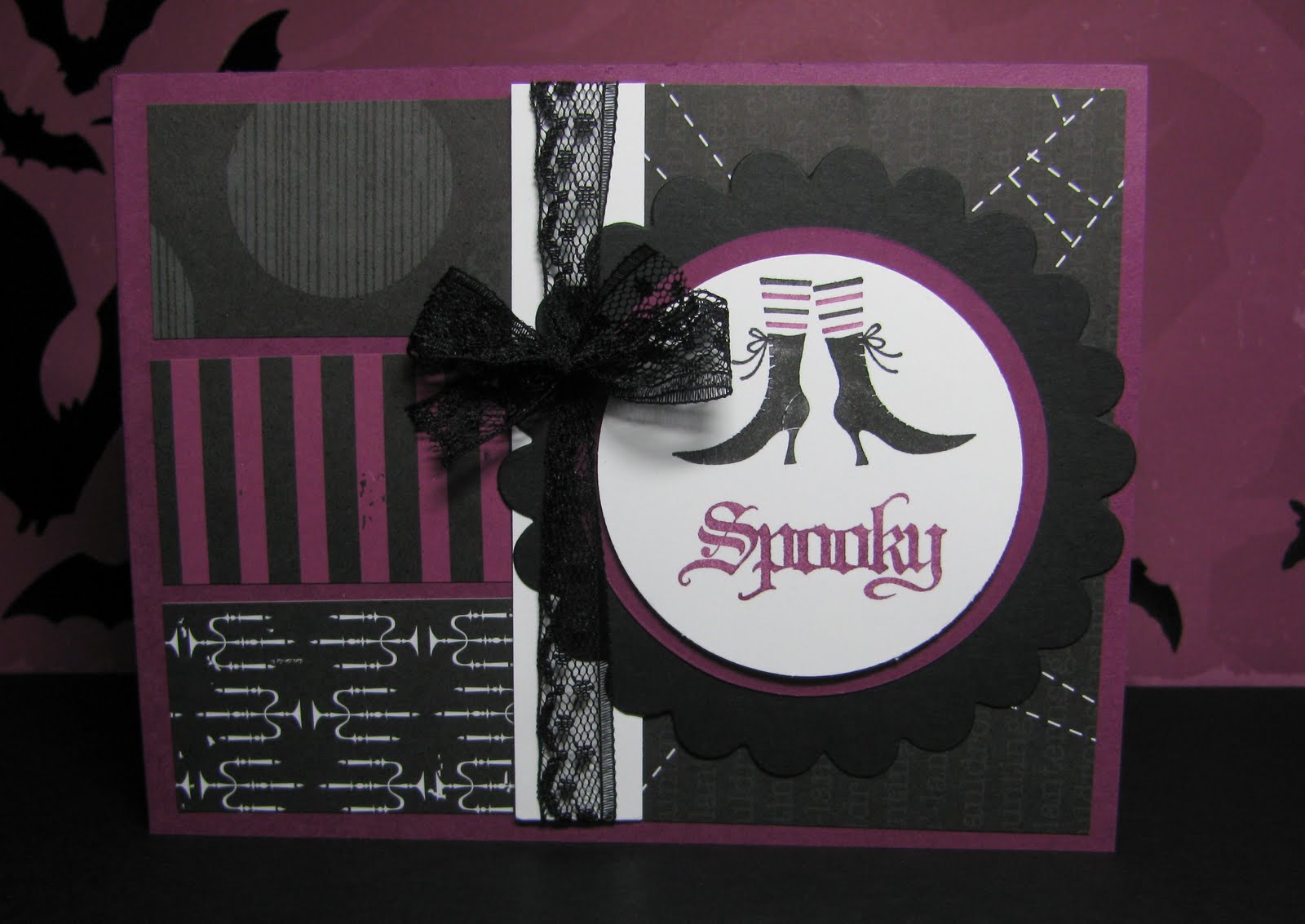 I used some Rich Razzleberry cardstock to co-ordinate with my Wicked Fun specialty designer series paper. I also used some of the AMAZING Raven Lace Trim from the Holiday Mini Catalogue for some embellishment. This stamp set is going to get A LOT of action in the next few weeks at my house!!!