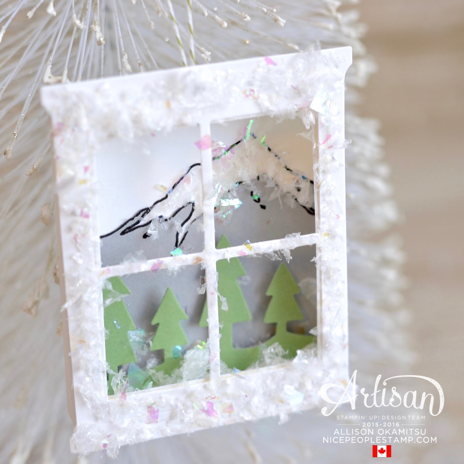 This last ornament uses the Hearth & Home Thinlits for a snowy view out a window. To create the little box that sits on the back of the window die cut, you’ll cut a piece of Whisper White Cardstock 4 x 4 ¼” and score ¼” and ¾” on every side. Fill the little box with your scene, like trees from the Outdoor Adventure Framelits and a large mountain from the Mountain Adventure stamp set, before gluing the box onto the window frame.