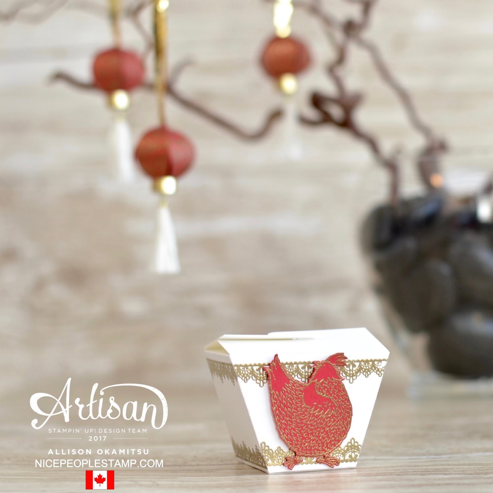 Keeping with my theme of gold and red, I added some gold embossing to the takeout container using the Delicate Details Stamp Set*. Each year in the twelve-year Chinese zodiac cycle is represented by an animal and element. This year marks the year of the fire (or red) rooster. The Hey, Chick Stamp Set* was perfect for adding in the iconic rooster image.