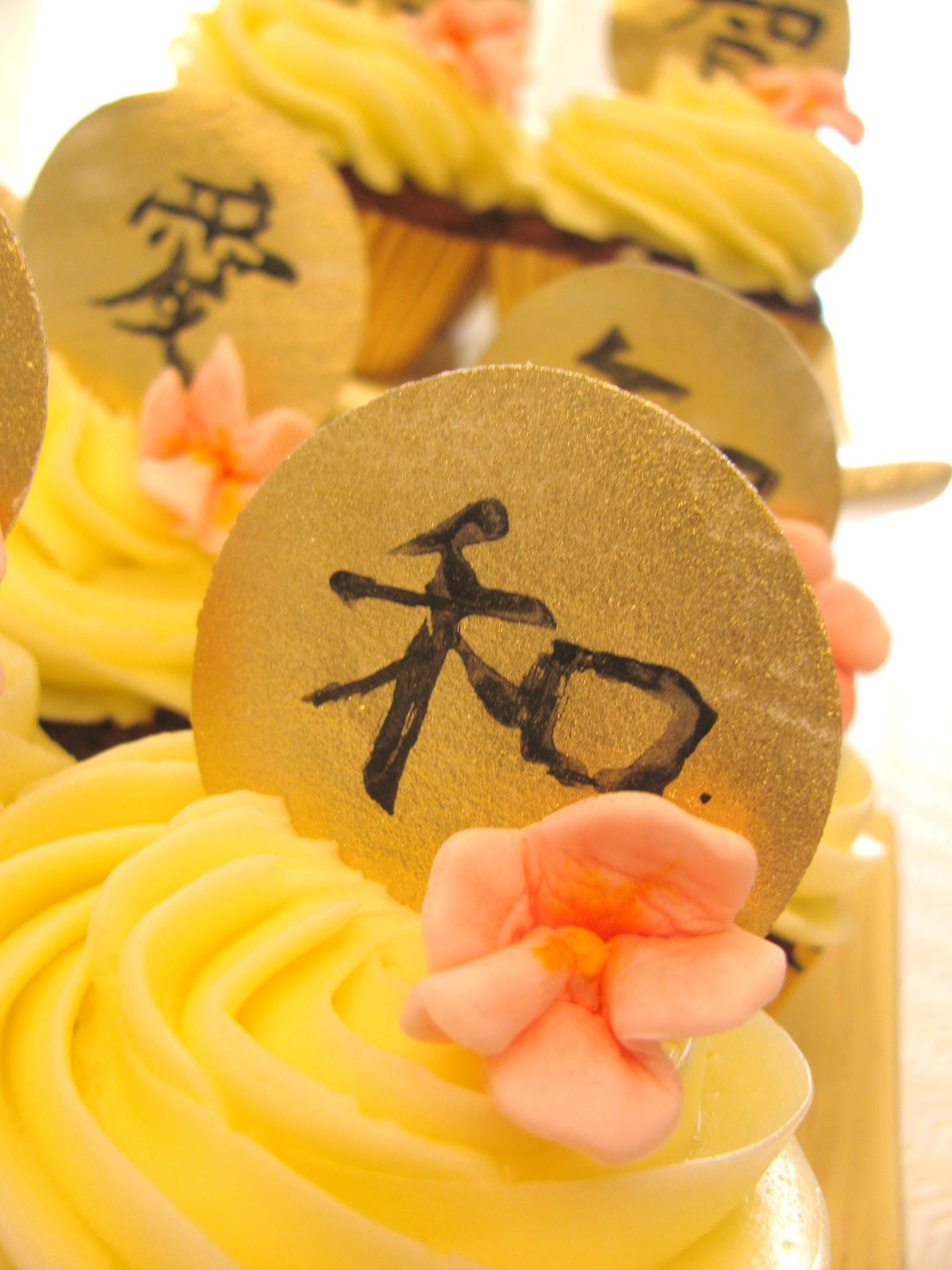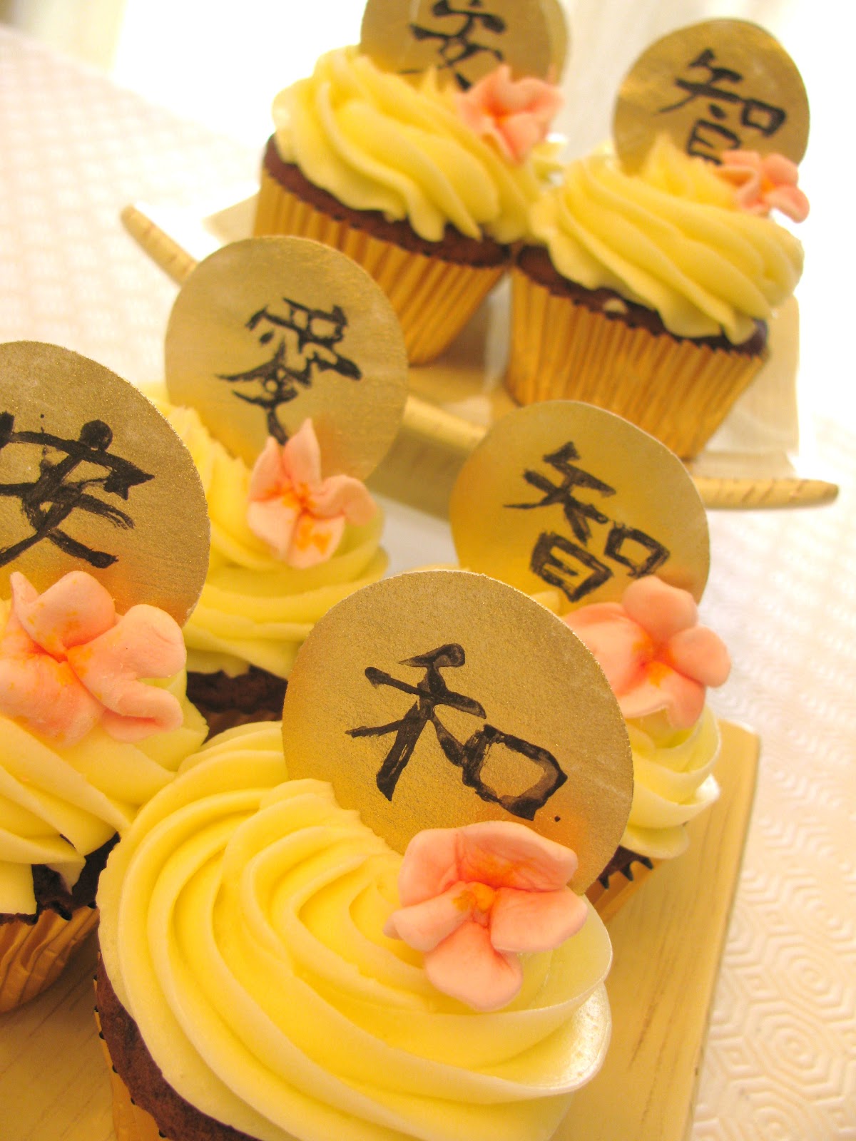 I made chocolate cupcakes with vanilla bean Italian buttercream. Near the end of the night one of the ladies asked me where I found the gold embellishments with the Japanese characters on them. So just in case I get emails asking about those, I didn’t buy them, I made them.