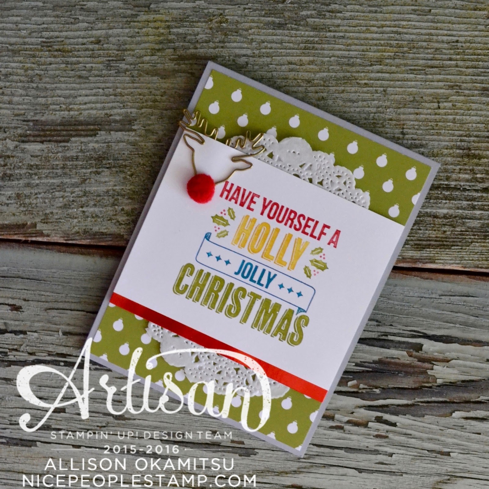 Today’s card is one I made with my SE Calgary Stampin’ Up! Card Club ladies in November. I’m a big fan of the Jolly Christmas stamp set. I just can’t seem to get enough of it, and I LOVE it with the sentiment coloured all bright and fun with my Stampin’ Write Markers!