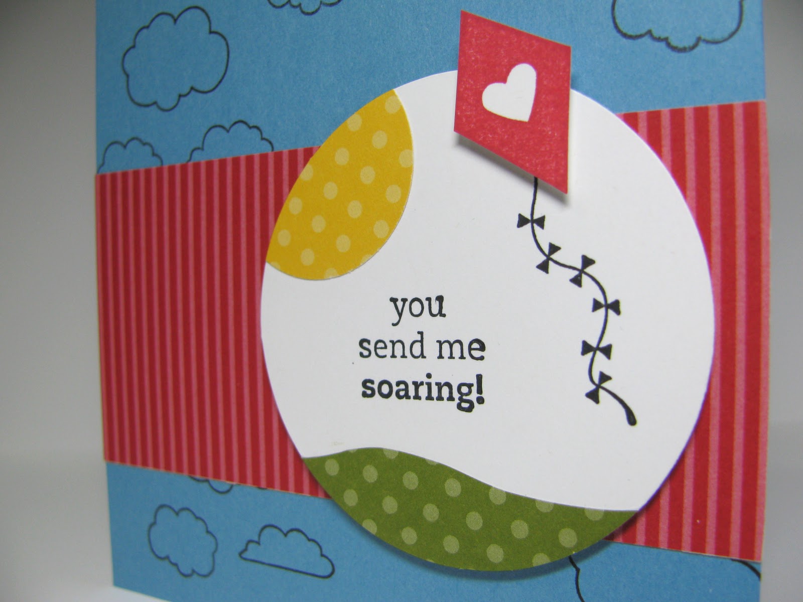Anyways, onto the card. This one uses the new Send Me Soaring stamp set from the Occasions Mini Catalogue. Ok, don’t judge me, but I originally bought this stamp set for the clouds. I know, it seems a little over the top to buy a whole stamp set just for one image, but I really really really like those clouds! And of course once I had that new rubber in my hot little hands I started to play, and now I love the rest of the images too! 🙂