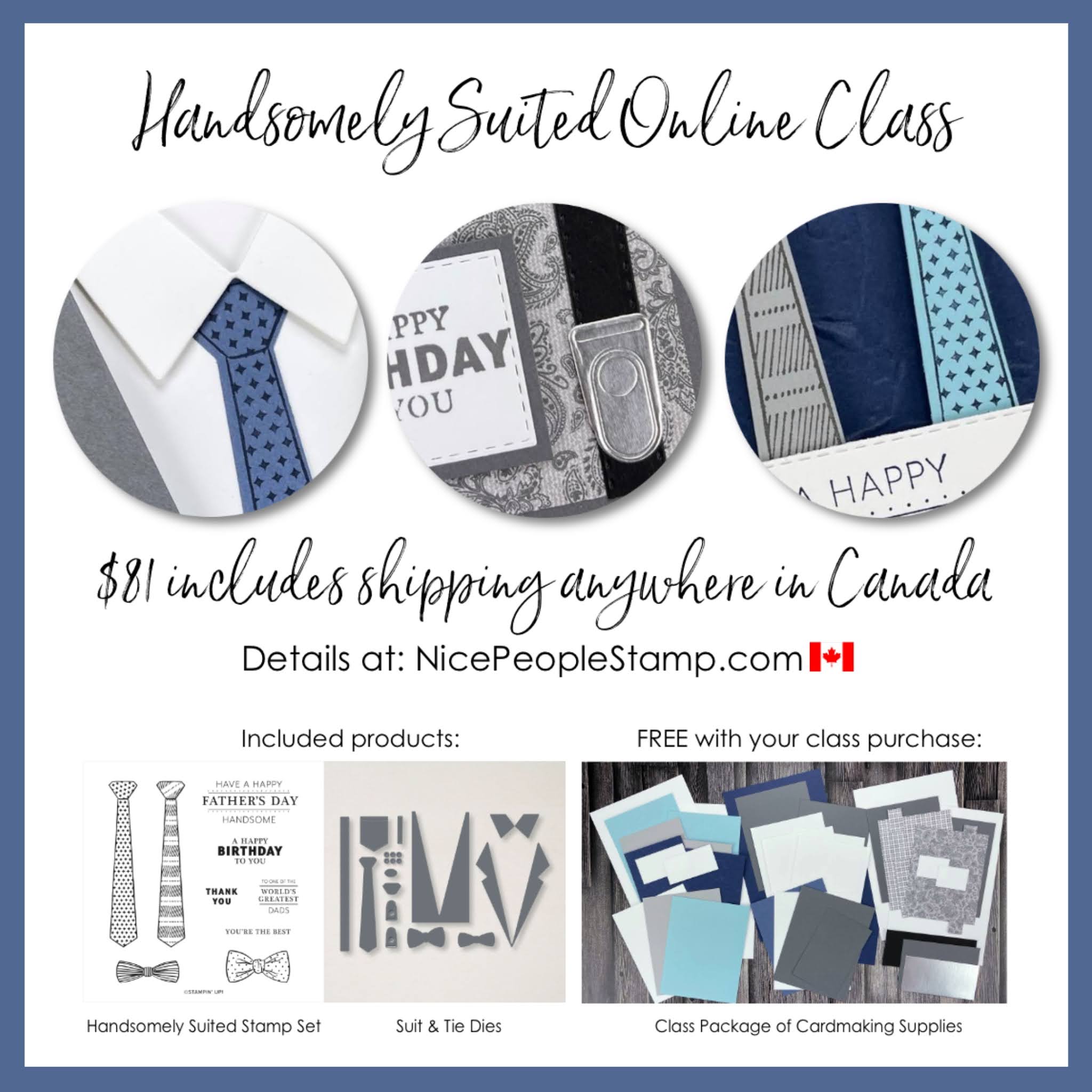 This class to go kit is $81 (including shipping), has the supplies to make 6 cards and includes the Handsomely Suited Bundle of stamps and dies. You’ll just add your own adhesive, clear blocks for your stamps, and ink pads (Night of Navy & Basic Gray – or use what you have). You will also need a machine that works with Stampin’ Up! dies. If you already own the included bundle, please email me and we can make substitutions.