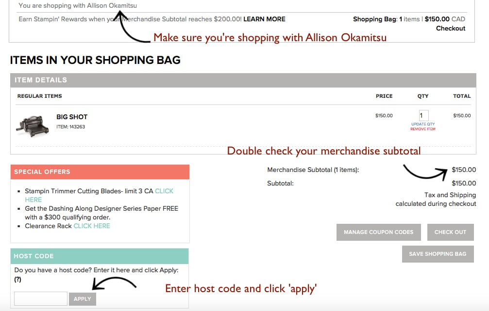 May Mystery Gifts Promotion | FREE Embellishments, Tools, Stamp Sets, and more! | Stampin’ Up! Canada May 2, 2020 by Allison OkamitsuLeave a Comment 2 May I’m so excited to bring you a super fun, brand new promotion for May! For every $50 ordered using the host code you’ll receive a FREE Mystery Gift! I have a big stash of brand new embellishments, tools, stamp sets, and more! I can’t wait to gift them to you! You must use the May host code to receive your gifts, so please be sure to add that in. May Host Code: G4TERQ7Q How to add the host code to your order: ** These gifts are cumulative! For EVERY $50 ordered before shipping and tax in the month of May you’ll receive a Mystery Gift! Let’s take a peek at some of the gifts I’ll be spoiling you with, I have LOTS more! Shop in my Canadian Online Stampin’ Up! Store to qualify! Shop in Canada with me!