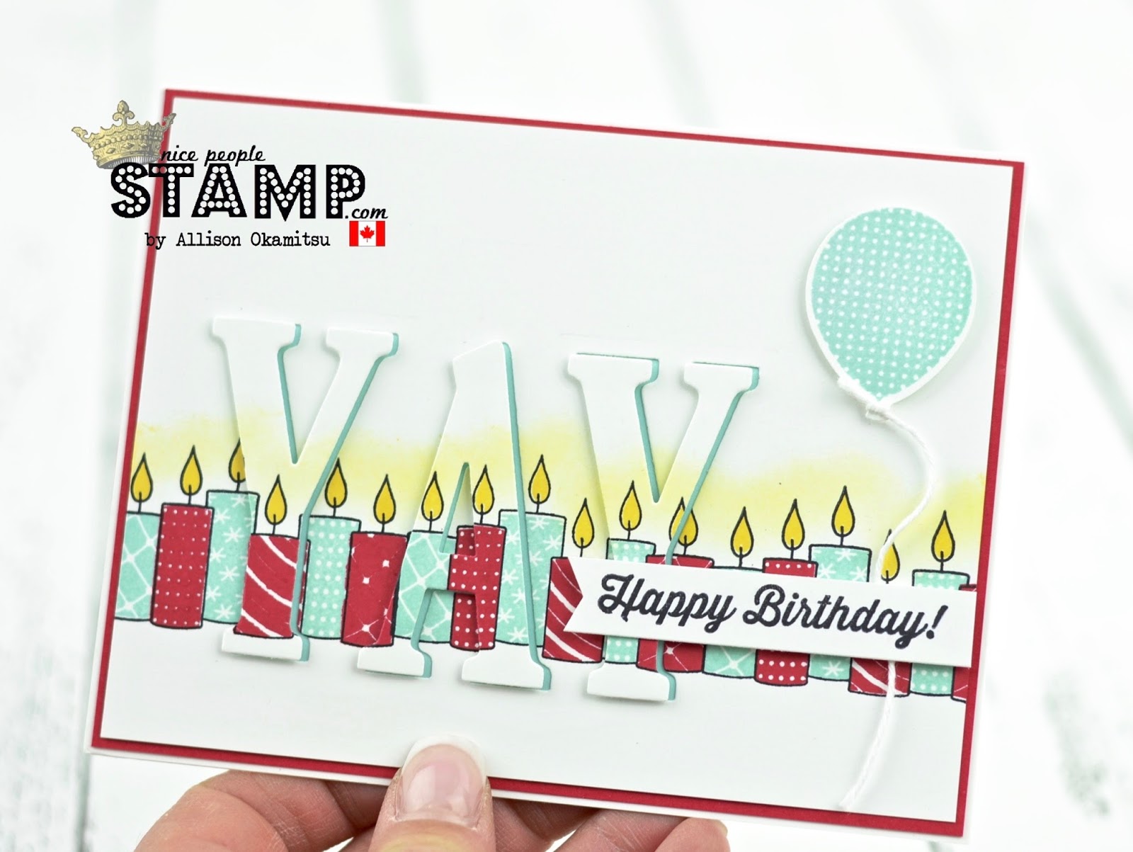 Just because Merry Patterns is a ‘Christmas’ stamp set, doesn’t mean you can’t use it for birthday cards. The candle stamp is perfect! I also added a sentiment and balloon image from the Birthday Banners Stamp Set for a little added birthday flair.