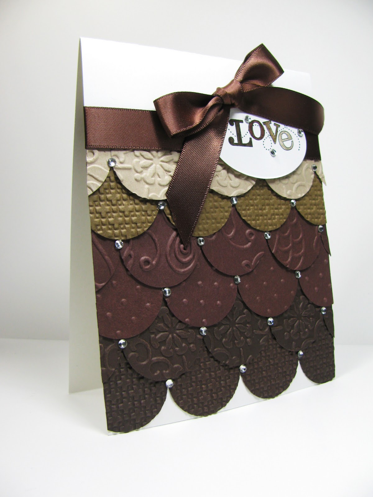 Today’s card was cased from Kristen Nicole Cunningham. She made a really pretty version in yellow, but I wanted mine to be a little more masculine, so I did it in browns. And since Valentines Day is just around the corner I thought this would be the perfect card for my husband. Do you think adding all those jewels will inspire him to buy me something sparkly? Diamonds perhaps? A girl can dream. 🙂
