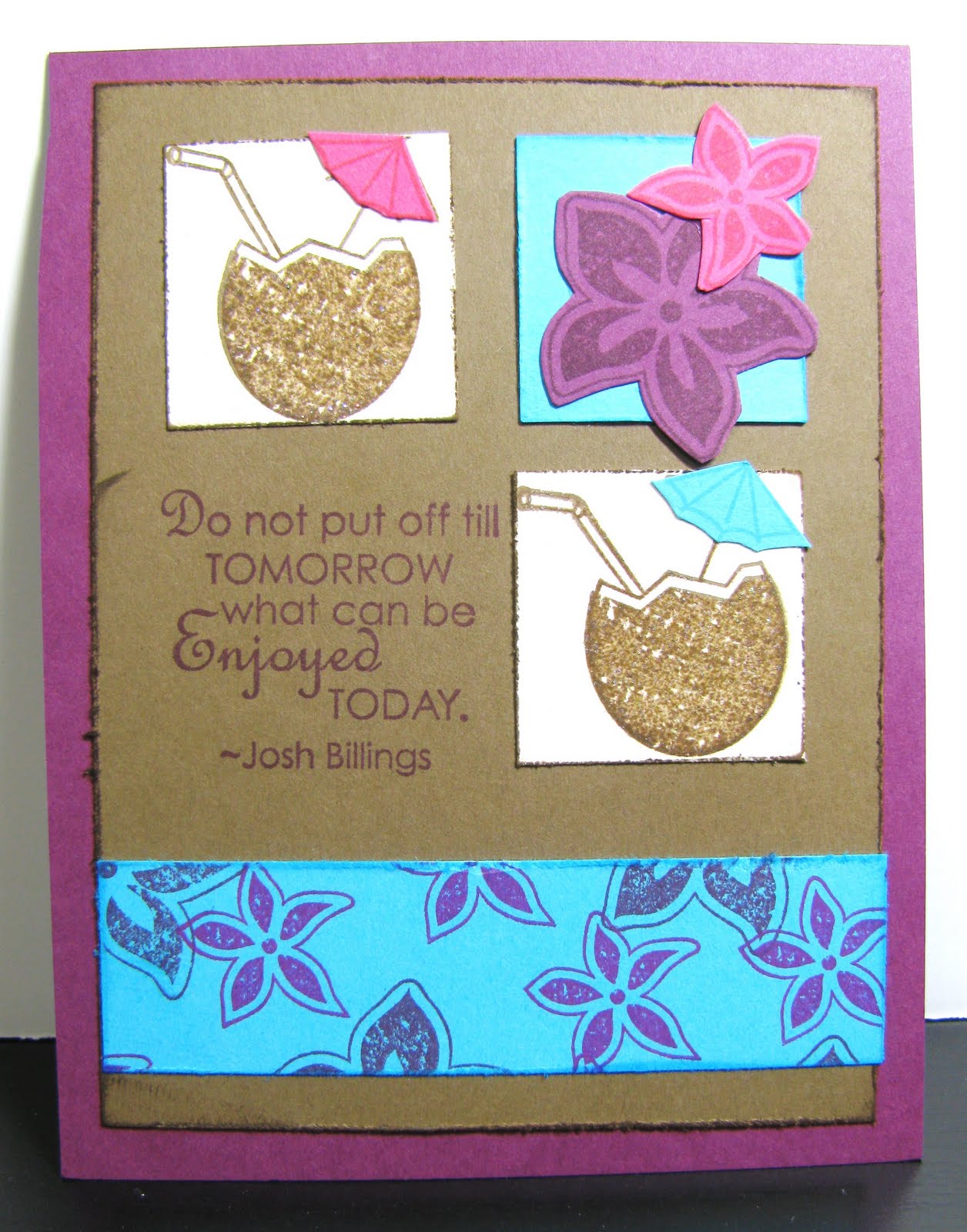 Thanks to Laura Lawson for this card! I have been using the Tropical Party stamp set like crazy for scrapbooking, but doesn’t it look great on a card as well?!?! Thanks for the idea Laura!