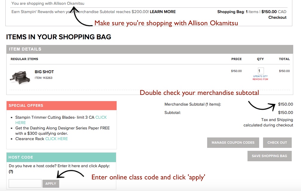 If you already own any of these products, feel free to substitute with the products of your choice, you’ll just need to make sure your subtotal before shipping and tax is $71.50 and you use the class host code to receive the cardmaking supplies and instructional video for free.