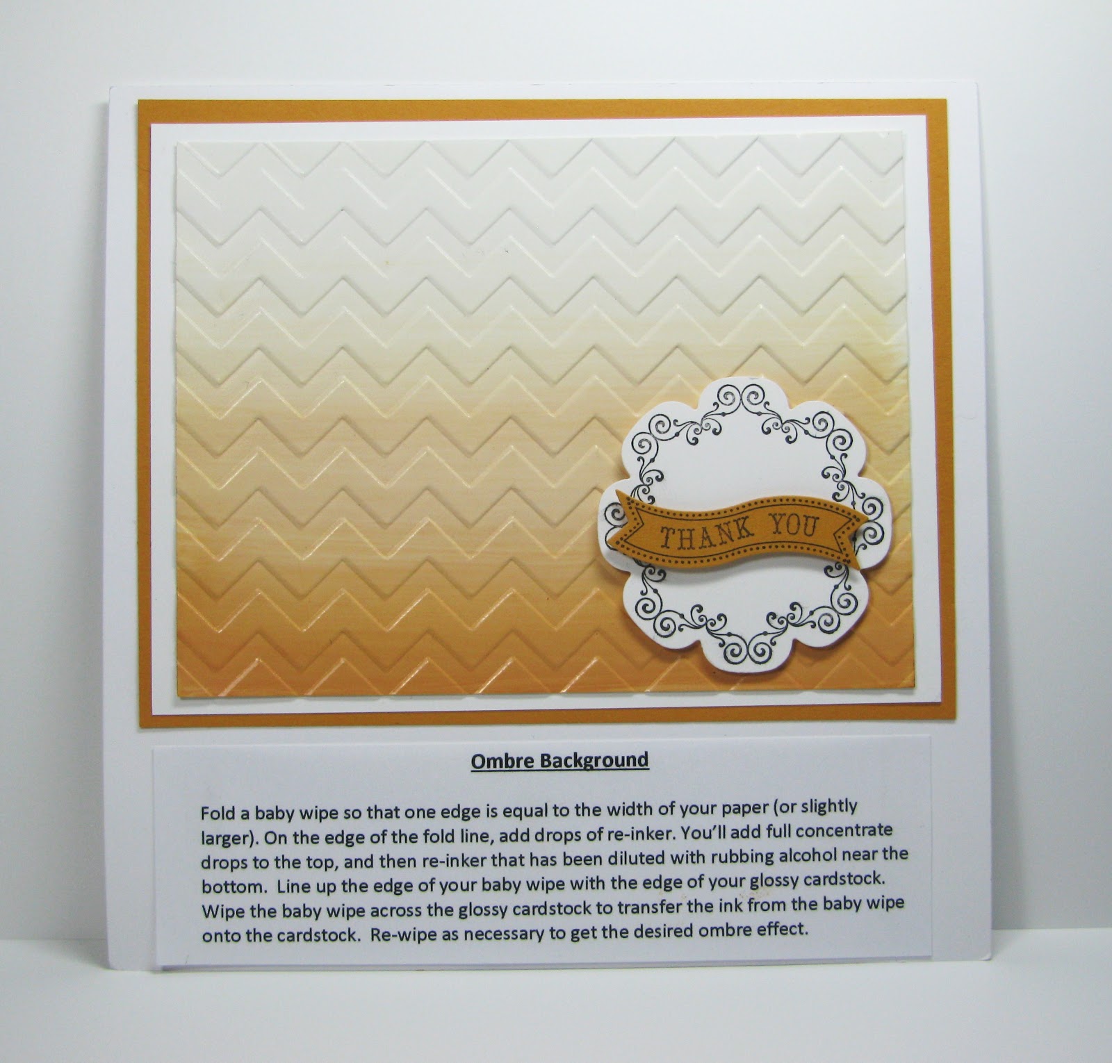 This month our projects were ALL about ombre! We did three fun techniques this month showcasing this fun trend. The background on today’s creation was made using a baby wipe, reinker, an aqua painter, rubbing alcohol, and glossy cardstock. It sounds complicated, but it’s super easy. You can click on the picture to view the enlarged directions.