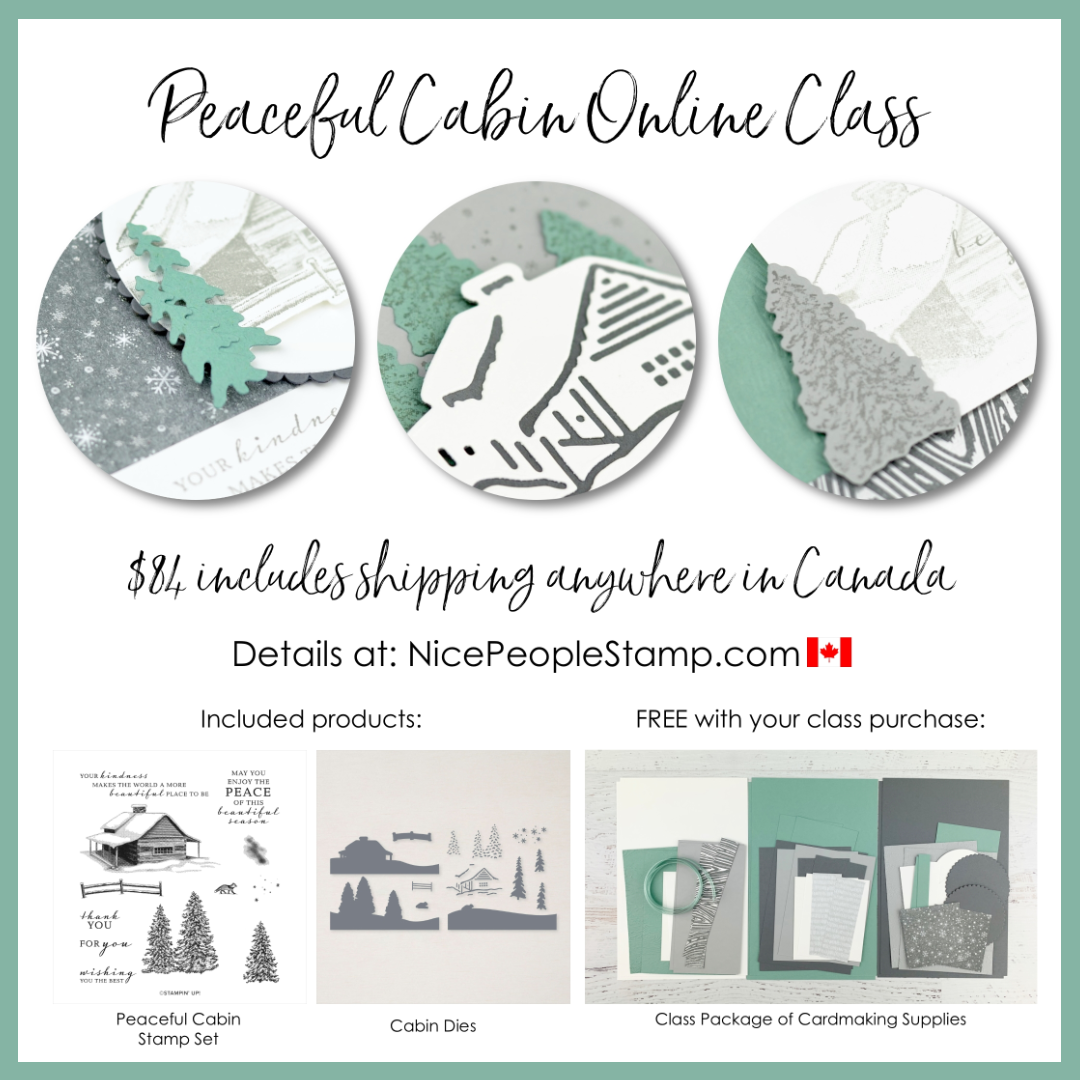 This class to go kit is $84 (including shipping), has the supplies to make 6 cards, and includes the Peaceful Cabin Bundle of stamps and dies. To complete your projects you’ll just add your own adhesive, clear blocks for your stamps, and ink pad (Smoky Slate – or use what you have). YES you can make substitutions! If you already own the included bundle, please email me and we can swap for different items.