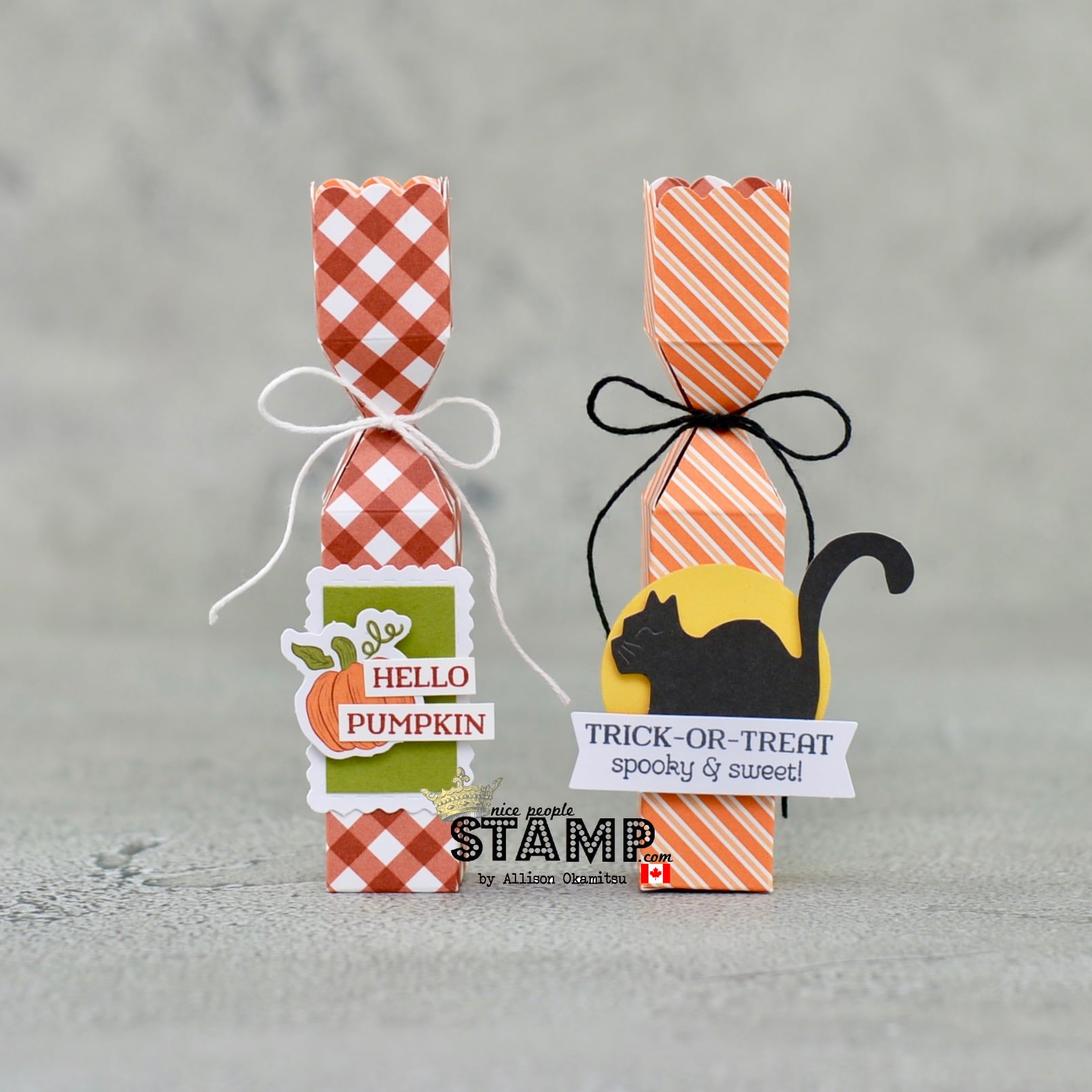 Paper Pumpkin is a craft subscription box that comes once monthly. In each box comes an exclusive stamp set, mini ink pad (called an ink spot), and the supplies to make that months project. This month was 20 cracker favour boxes – like the ones you have a Christmas dinner, but these ones were to be decorated for Thanksgiving and/or Halloween. They’re so super cute. Click HERE for the video of me making those.