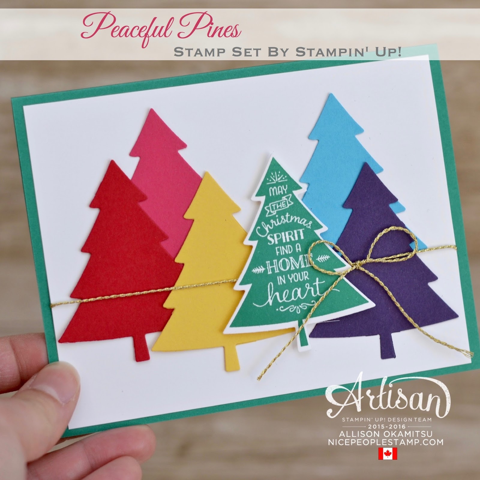 This card is simple, quick, and easy, but it packs a lot of WOW! The bright, bold colours I’ve used for the trees make a big impact, and I love that they just POP off the page. The Peaceful Pines stamp set and Perfect Pines framelits are a must for your holiday card making supplies.