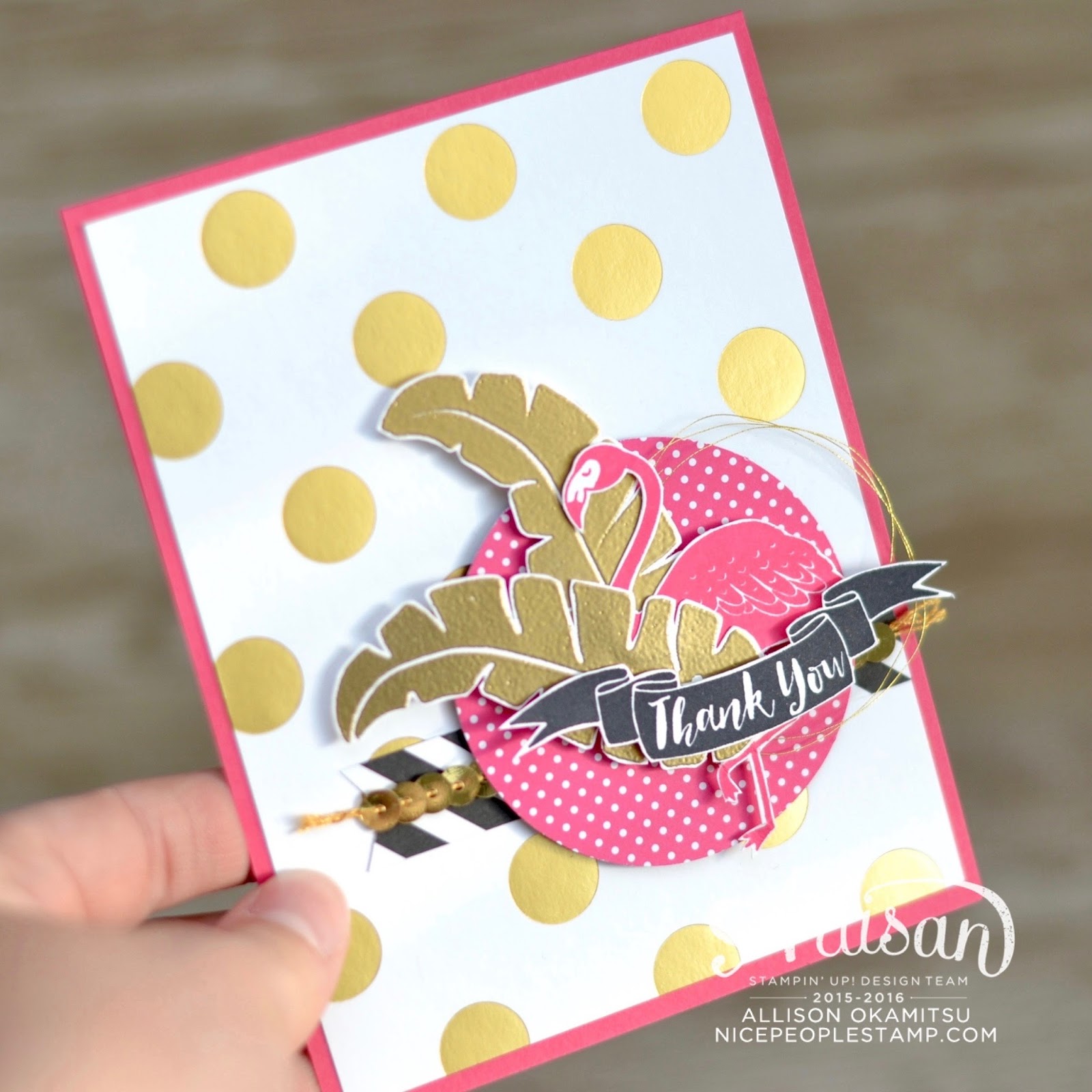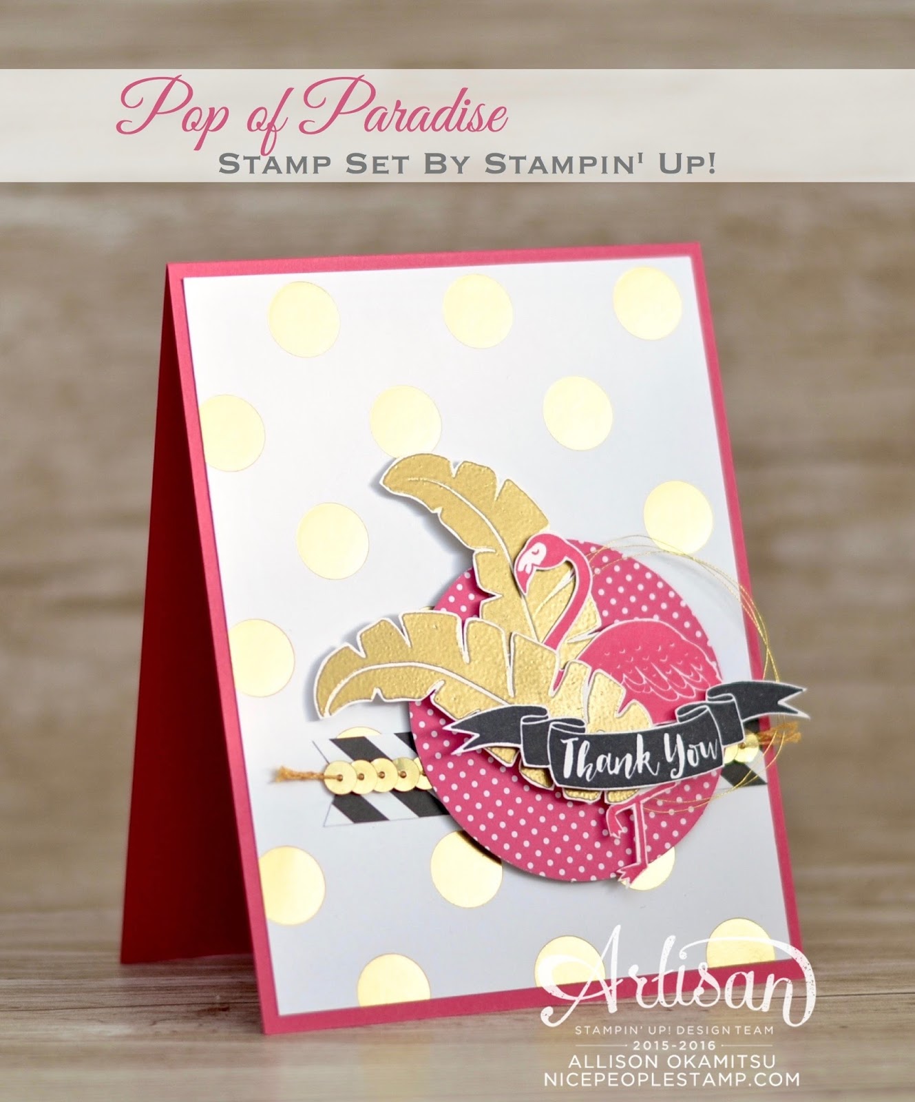 The Pop of Paradise is BLOWING UP! Everyone is ordering this baby, so make sure you get yours! I’ve also used the Pop of Pink Designer Paper, which is such a perfect combination with this stamp set. That gold foil polka dot piece is to die for!