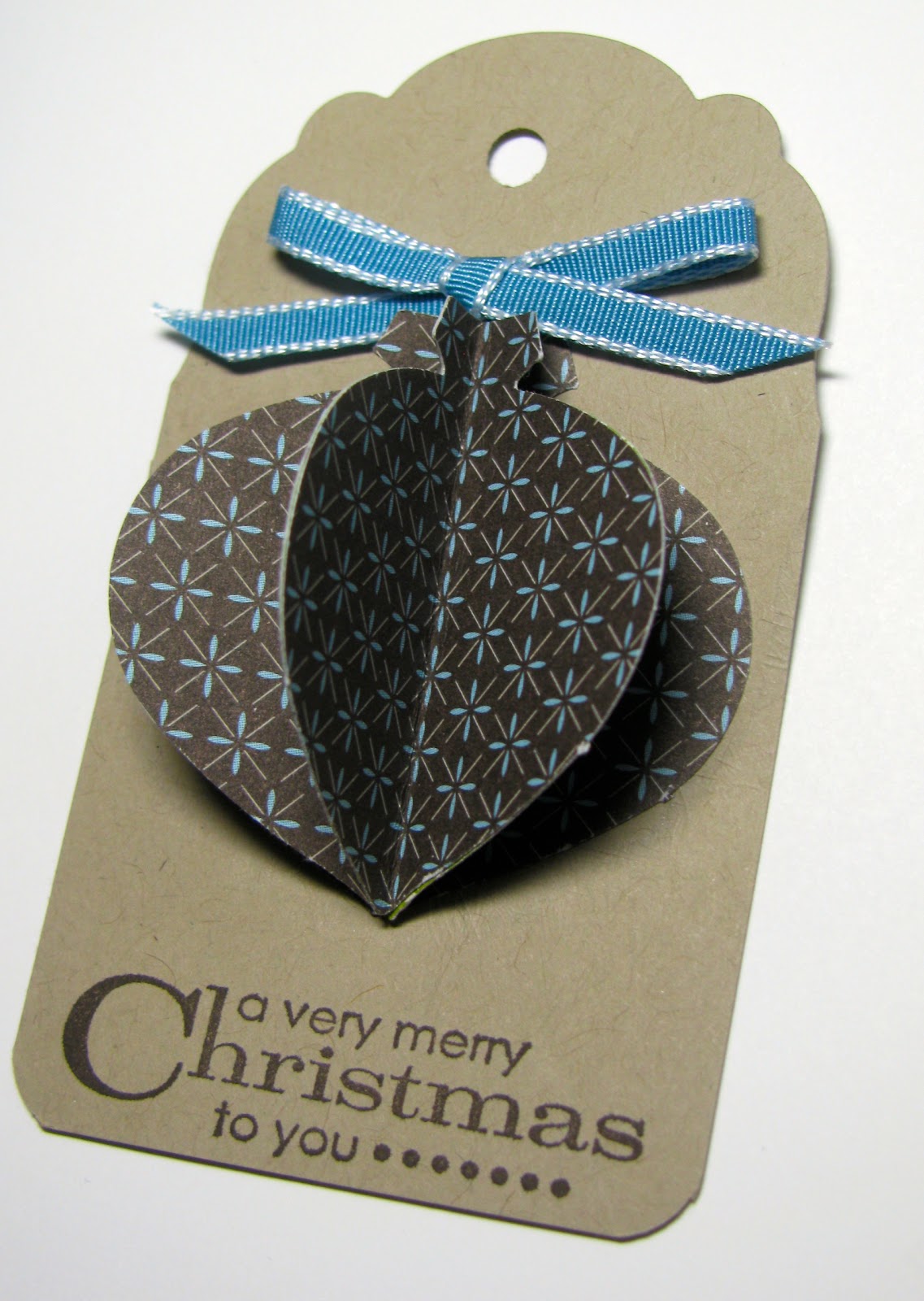 Enough about me, you’re here for the tag I’m sure. 🙂 This one came together quickly and easily, a perfect candidate for mass production. The pretty ornament was made by punching out 4 pieces of DSP with the ornament punch, fold them in half, and then glue the halves together back to back. They come together really quickly.