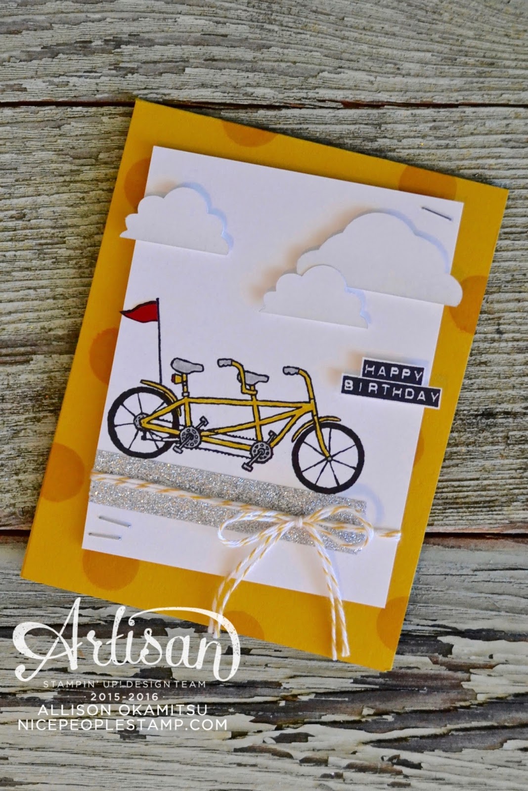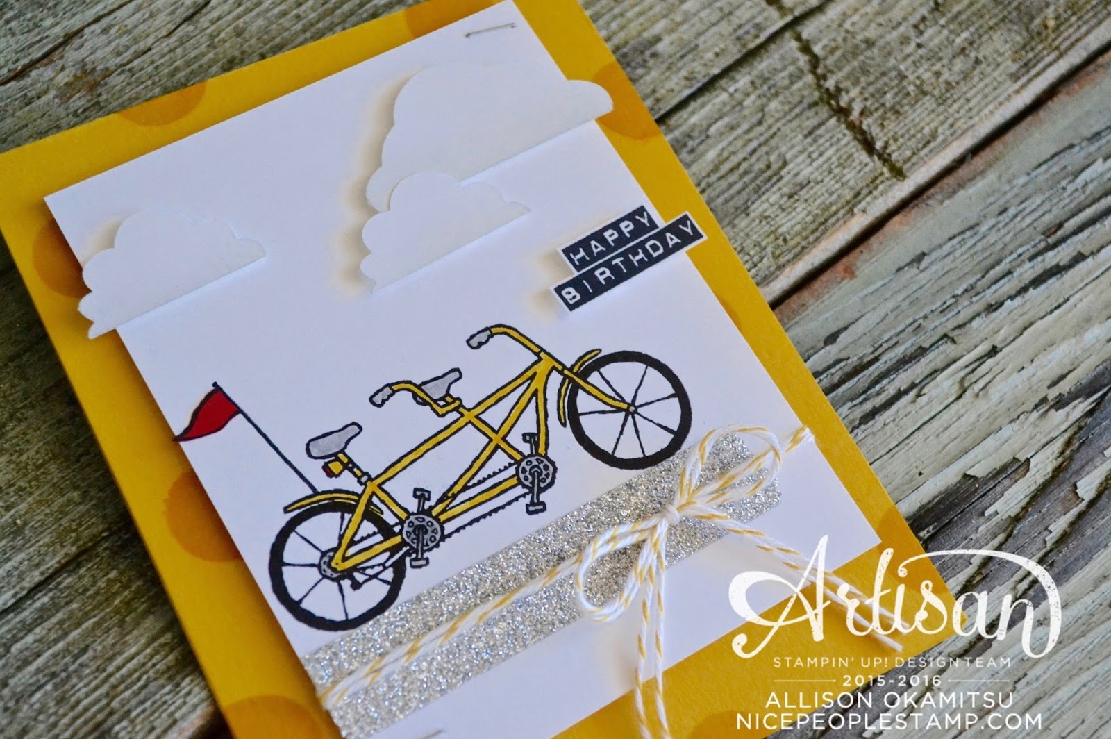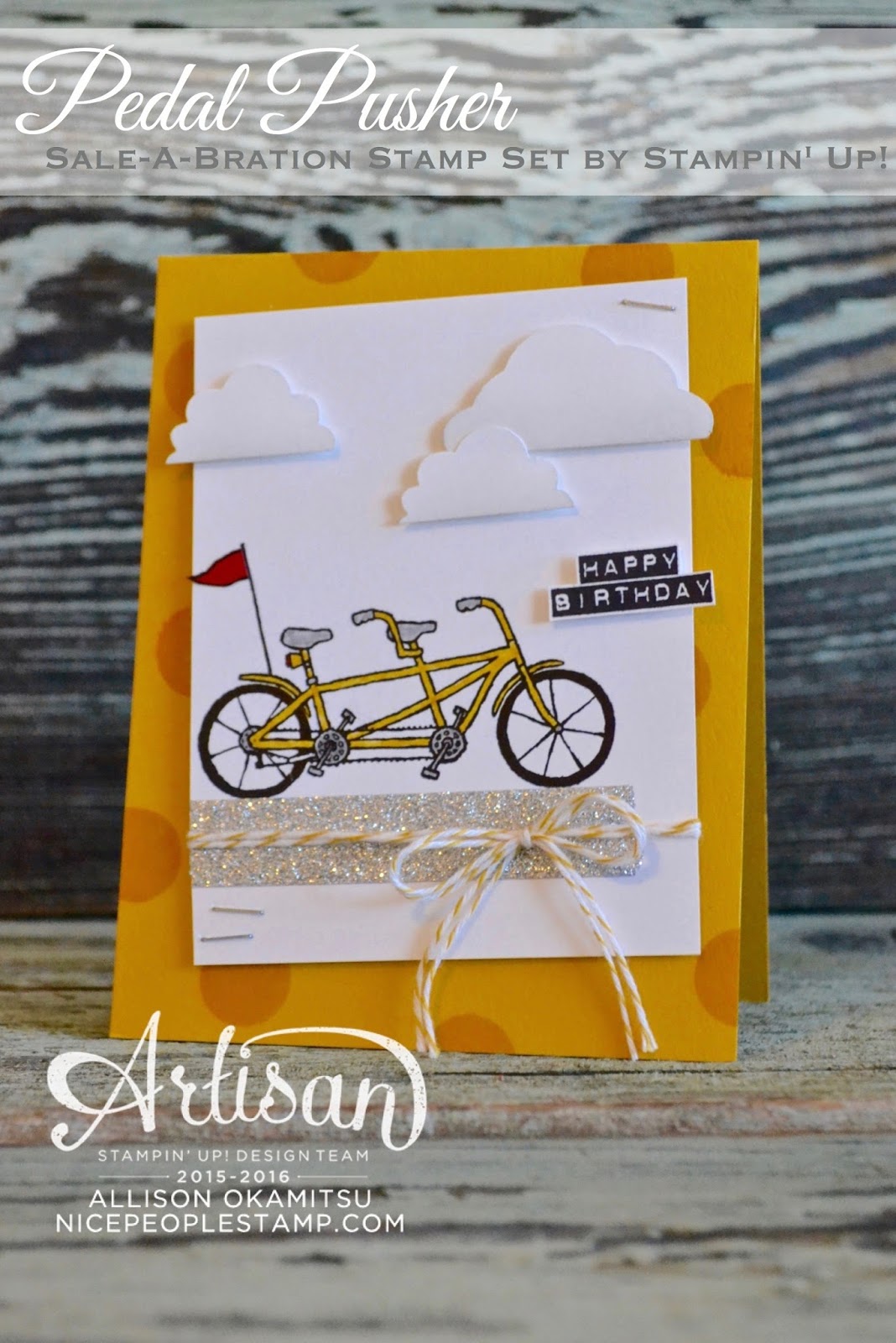 I have SO many great things to share with you about these new items! The Metallics Glitter Tape is FAB! It’s easy to tear, DOES NOT shed glitter (at all!), and is super sticky! And the Pedal Pusher stamp set is ADORABLE! Not only is there this super cute bike stamp, there’s also several sentiments, and also a little basket you can stamp on the bike with lots of different items you can stamp to place inside the basket. So super cute!