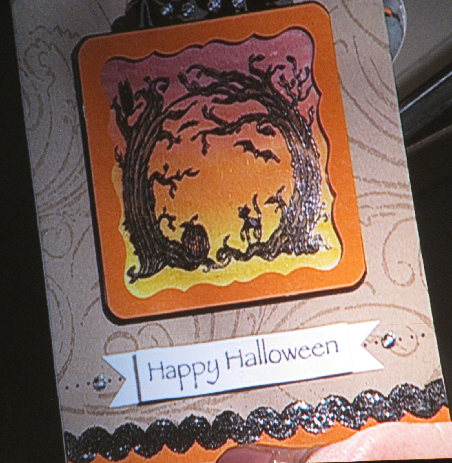 After lunch we had some great stamping presentations by Stampin’ Up! staff. Donna Griffith shared this SPOOKY Halloween banner. I know the picture doesn’t quite capture it, but this thing was so sparkly and blingy that you could see it across the room!