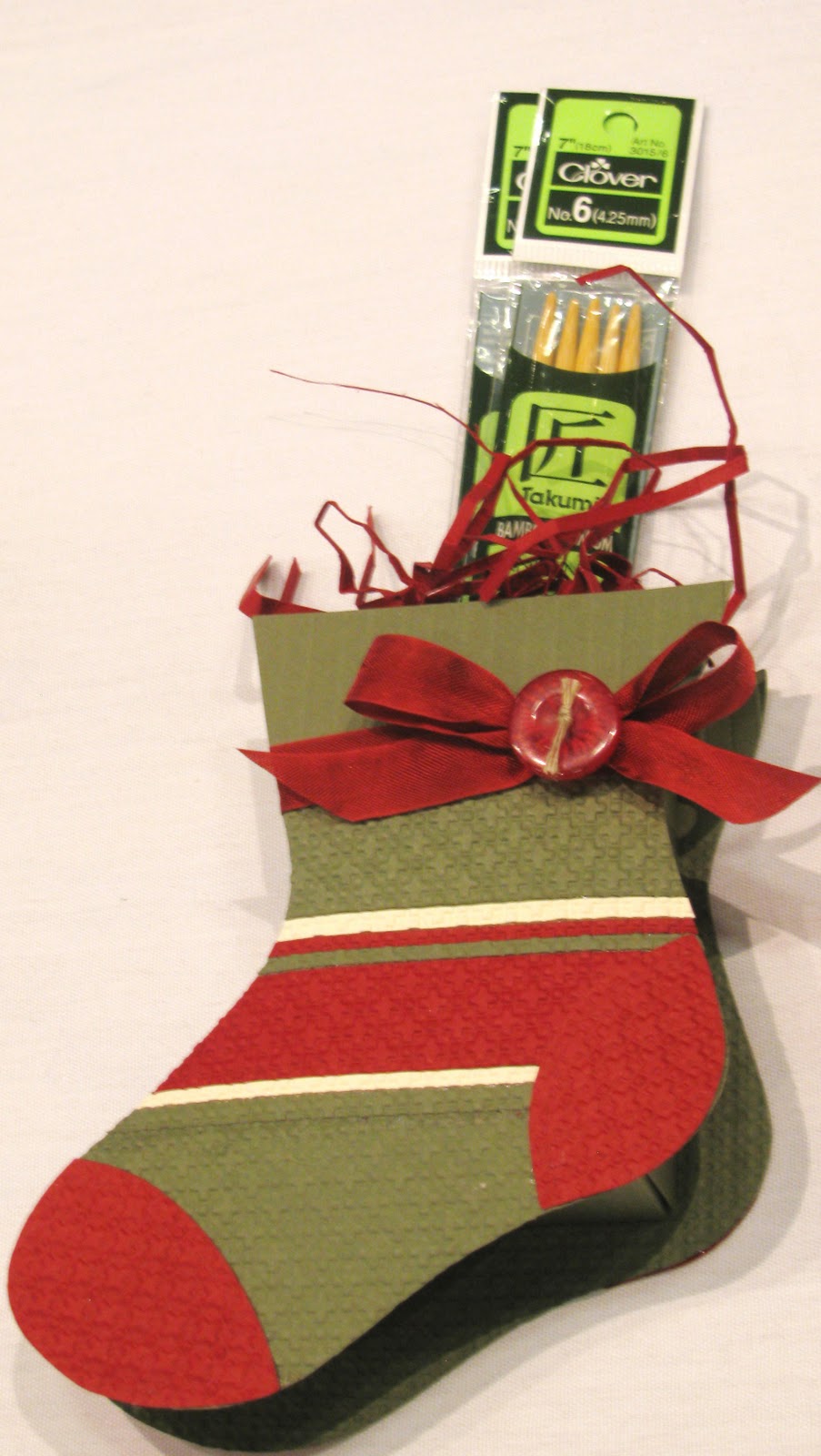 A pair of knitting needles in a cute little box that’s been decorated using the Stocking Die! What a fabulous idea!