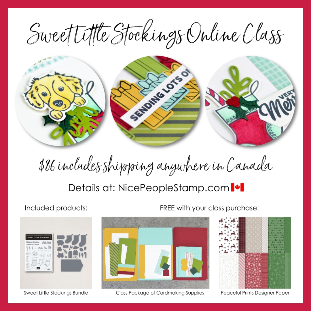How to order:Email me at allison@nicepeoplestamp.com to let me know you’d like to order this class. You can pay via email $ transfer or PayPal. I will order the supplies from Stampin’ Up! and once the order arrives, prepare all the kits for mailing via Canada Post.
