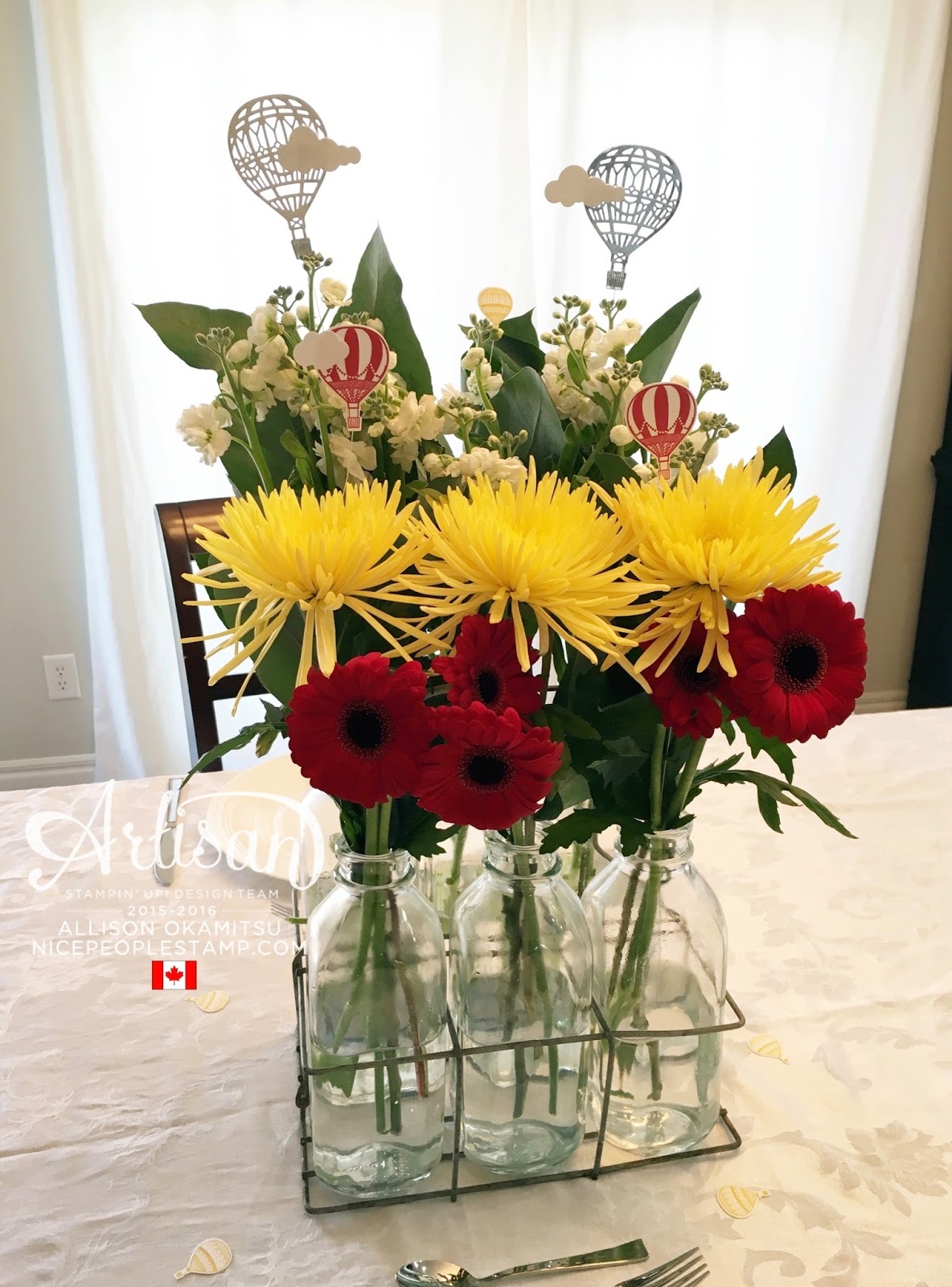 I used the brand new Lift Me Up Bundle to create the little balloon picks in the flower arrangement. I also created a special place setting for her that she could take home.