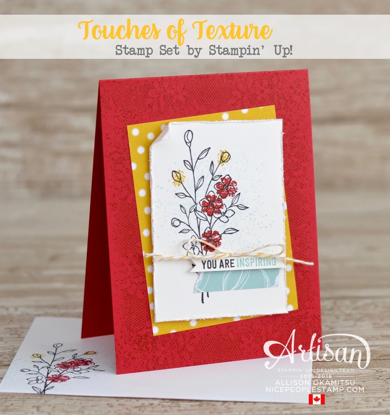 The invitations went out several weeks ago and I wanted them to be a sneak peek into what was to come. I used the Real Red and Crushed Curry colour scheme that was planned for the event, as well as the Touches of Texture stamp set to mimic the flowers on the bags I had special ordered.