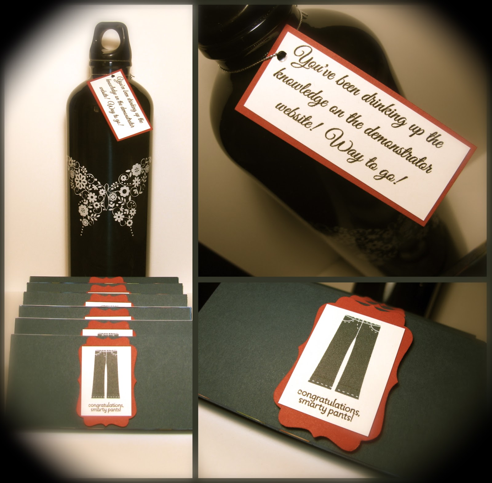 I love my team of Stampin’ Up! demonstrators! On Friday night some of us got together for a business dinner meeting, and then a few more joined us for a creative night of fun! We played a super fun game with questions and facts about Stampin’ Up! Of course I had prizes. 🙂 The grand prize was a Stampin’ Up! water bottle, and everyone got a cute decorated box of smarties for participating.