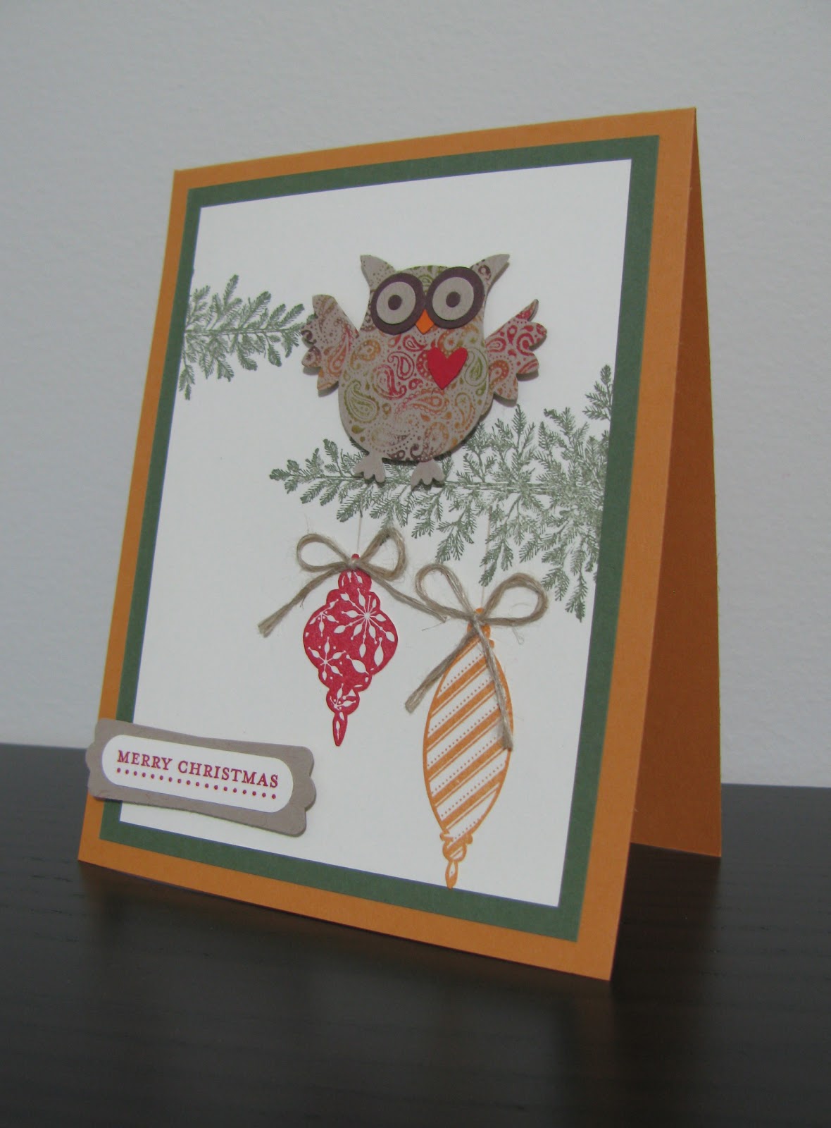 I’ve had this little punched owl sitting on my desk for what seems like forever. So whenever I clean up, I move him to a new spot and say ‘I’ve really got to put him on a card or something’. Well, that day finally came! And this cute little owl has a home! I used the Lovely as a Tree stamp set to add some branches, and then stamped some ornaments with the Tree Trimming stamp set. The colours in the owl kind of limited what I could use for cardstock, but I really like the Always Artichoke and More Mustard here. I don’t use More Mustard often, but I do really like it.