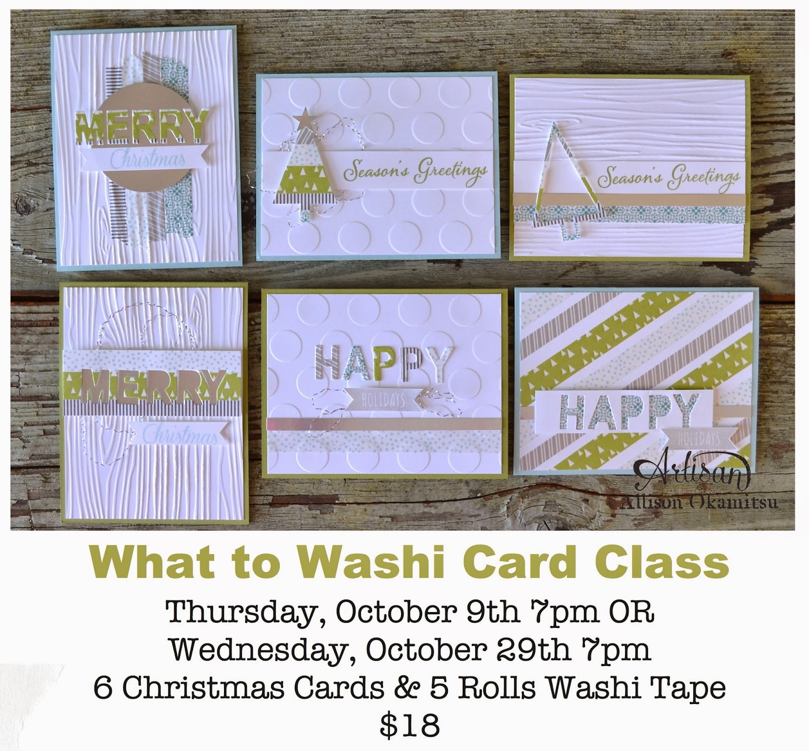 Love washi tape? Want to put it on everything? Yeah, me too. Join me to make 6 great cards, all featuring washi tape! And you’ll go home with your very own package of 5 All is Calm rolls of washi. Registration deadlines: Sept 28th for Oct 9th Class, Oct 16th for Oct 29 Class.