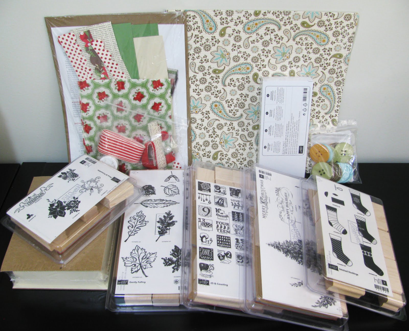 Being a Stampin’ Up! Demonstrator comes with many many perks. Stampin’ Up! is a fabulous company that rewards hard work with more than just a paycheck (although that’s fabulous too!). This August I received everything you can see in the picture above…for FREE! Now they don’t send these things to just everyone, but if you strive for and reach the goals and challenges that are offered, you too can get a big box of free stuff. 🙂